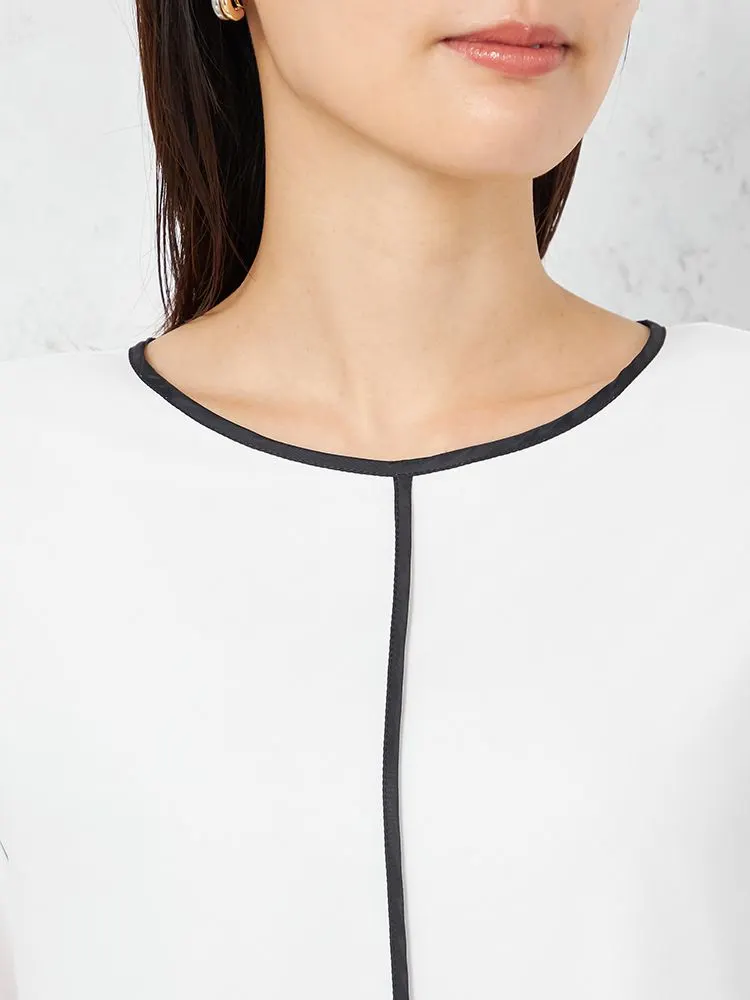 首元から身頃にかけて入れたパイピングのアクセントが、淡めカラーを引き締めて上品な印象に。