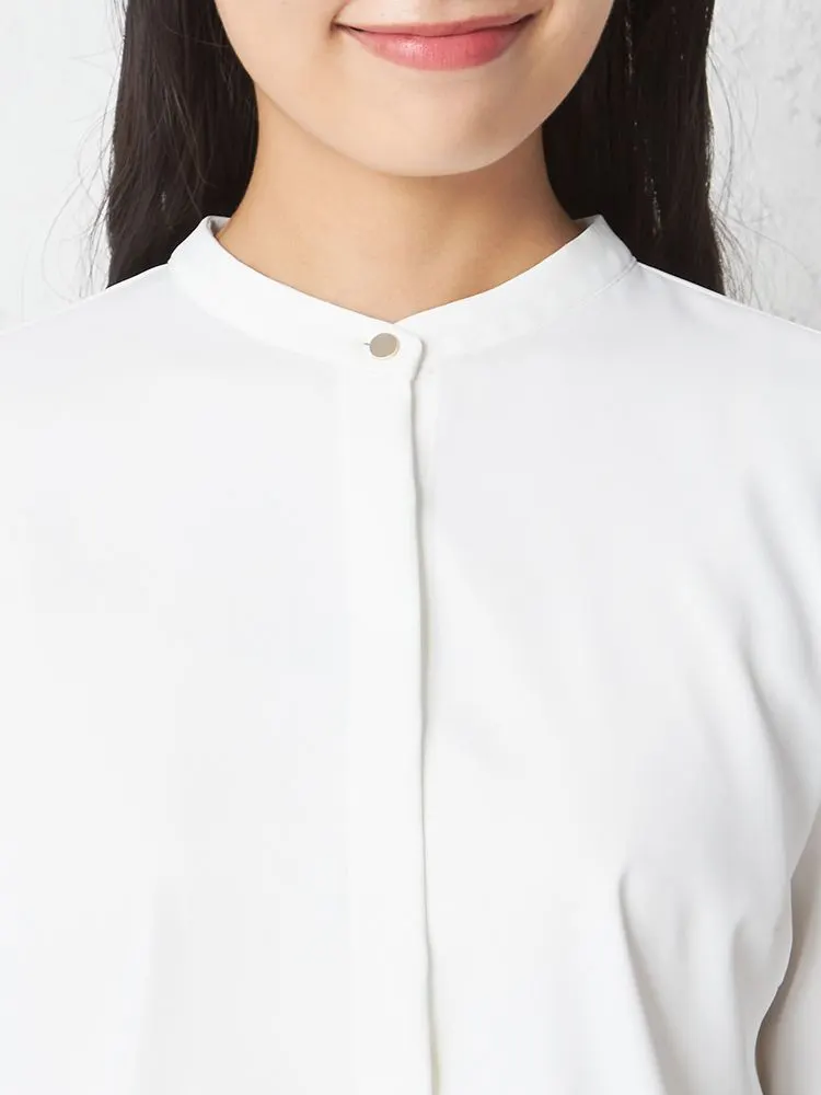 首もとのメタルボタンが上品なワンポイントになったブラウス。