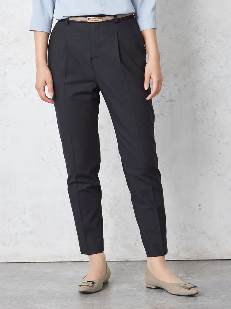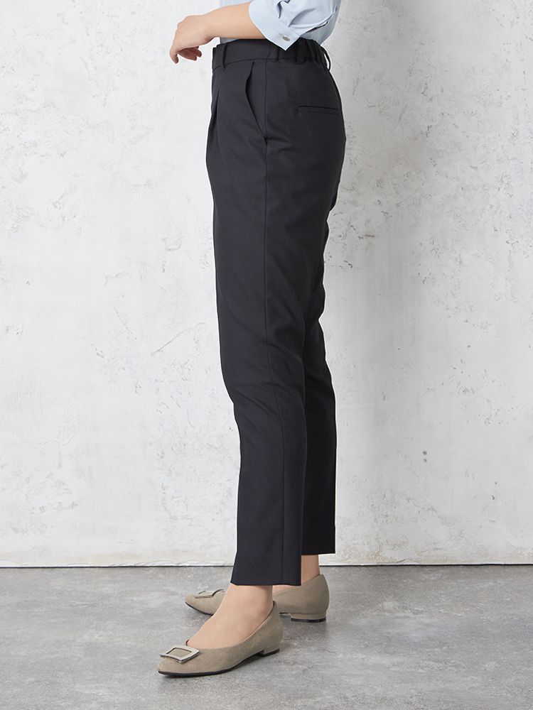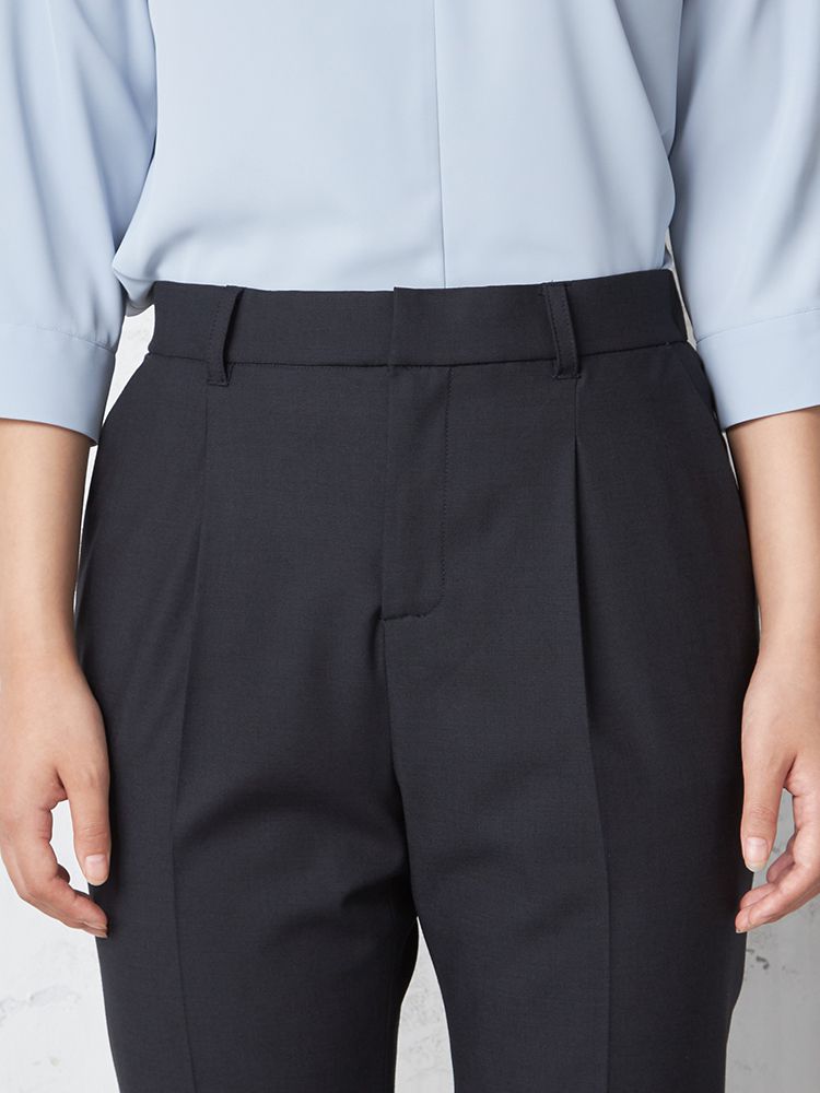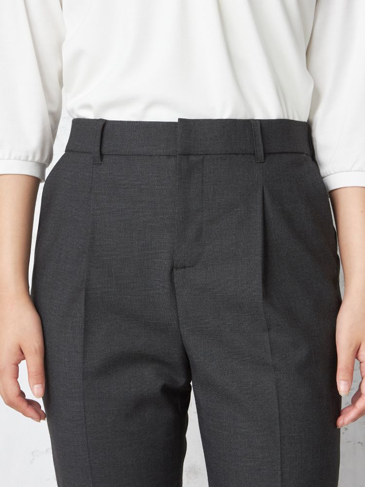フロントタックで腰まわりにゆとりをプラスしたセンタープレスパンツ。