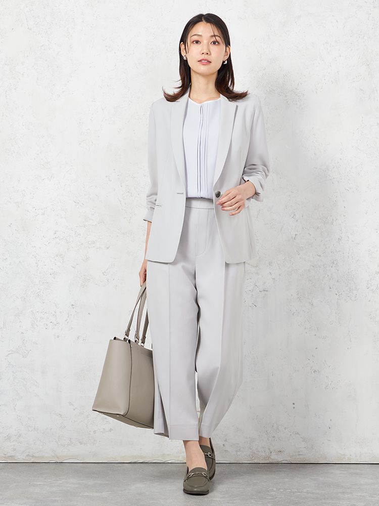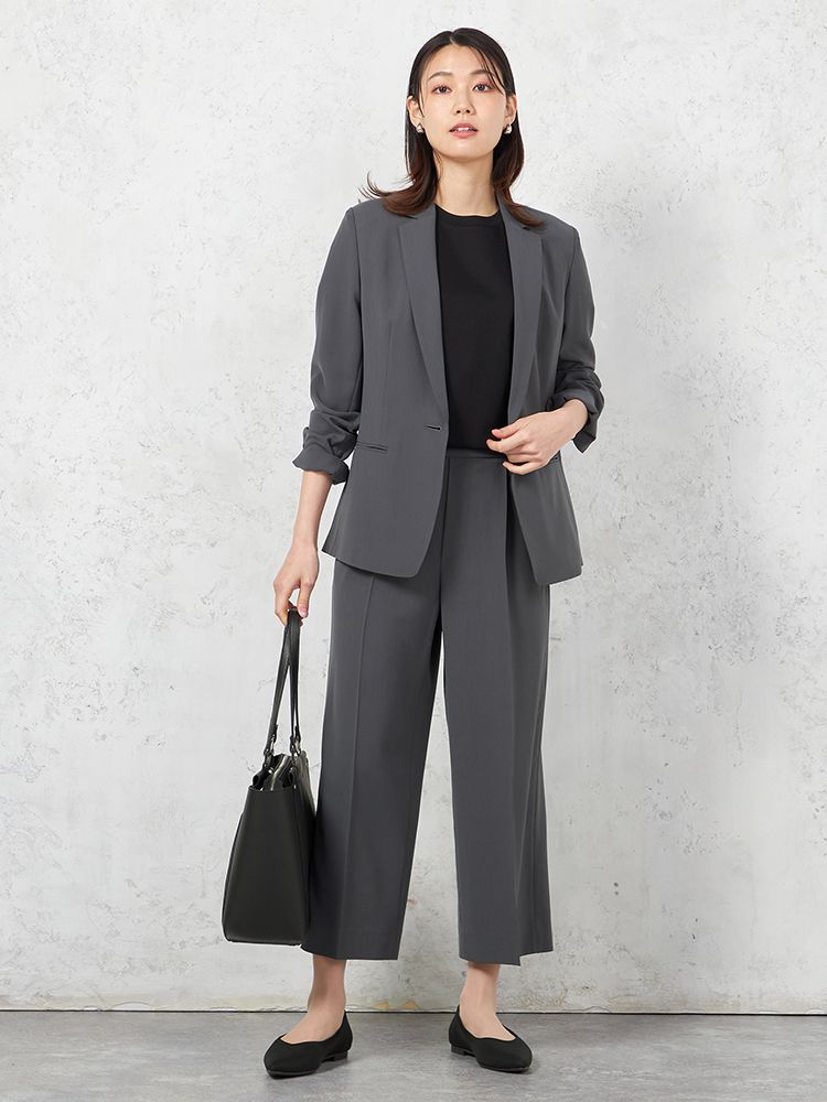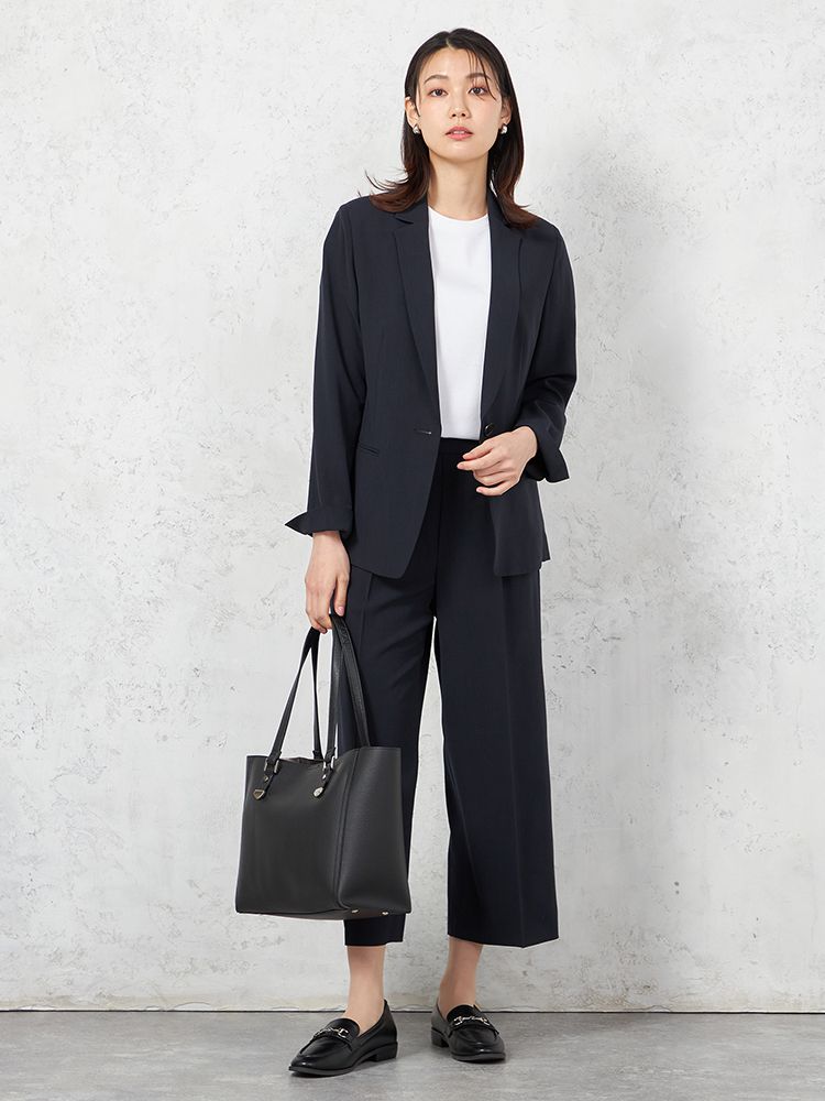 同素材のパンツやトップスと合わせたセットアップスタイルは、学校行事、通勤用として幅広く活躍します。