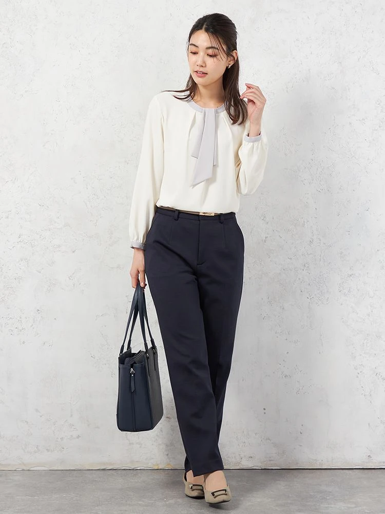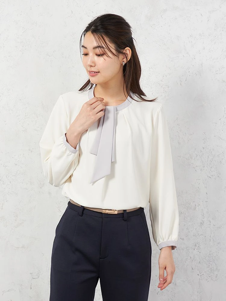 遠目にも存在感たっぷりな配色ボウタイがポイントのブラウス。