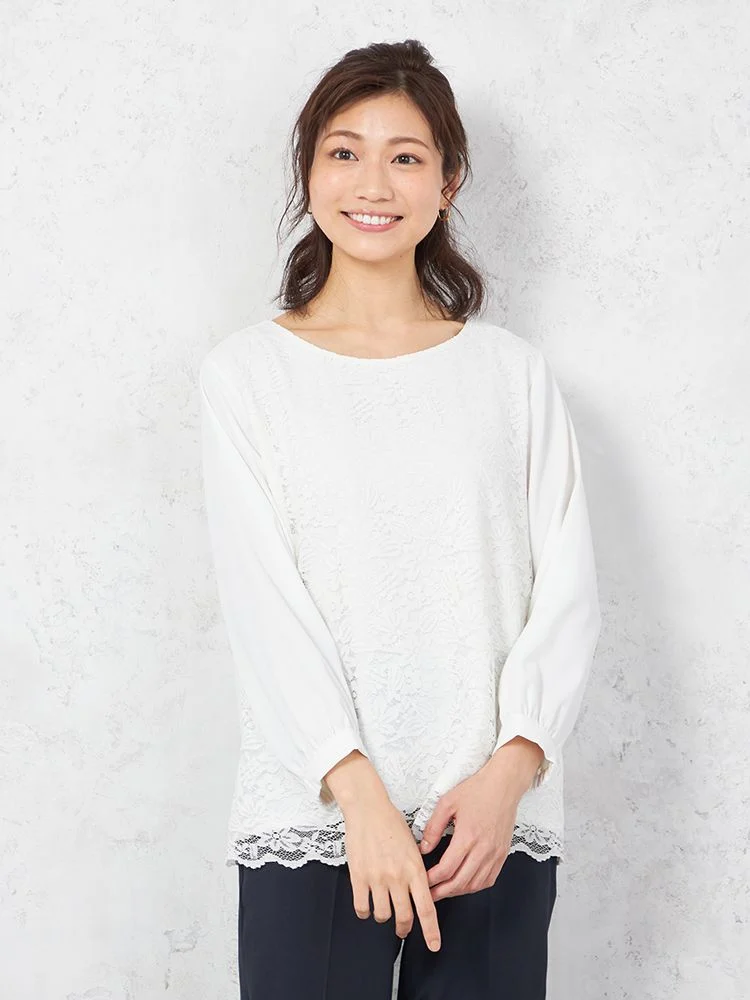 【ウォッシャブル】ブラウス 7分袖 レース重ね UV加工 中柄 SOFFICE 通年【レディース】