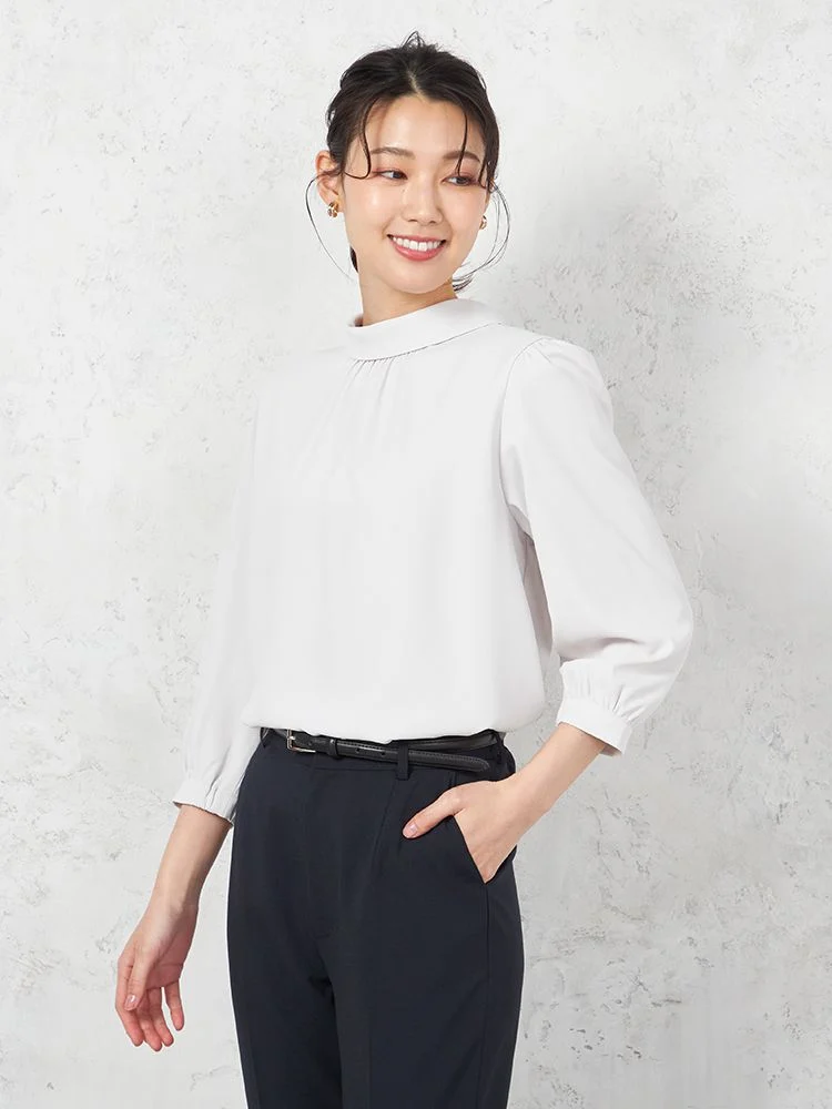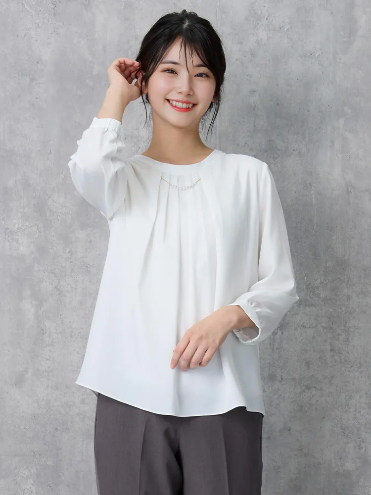 フロントタックディティールが上品な印象の7分袖ブラウス。