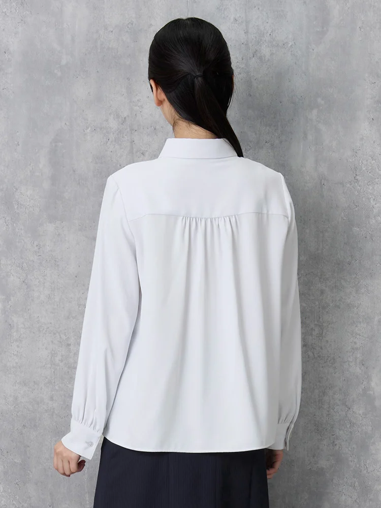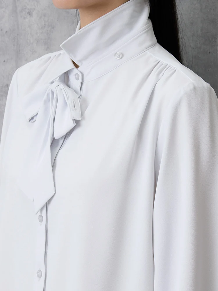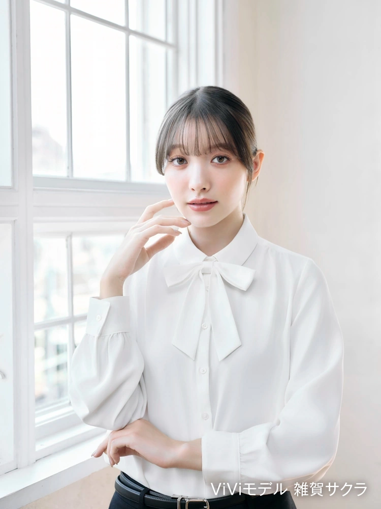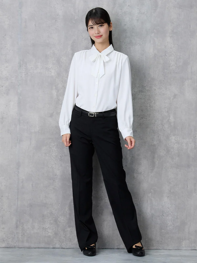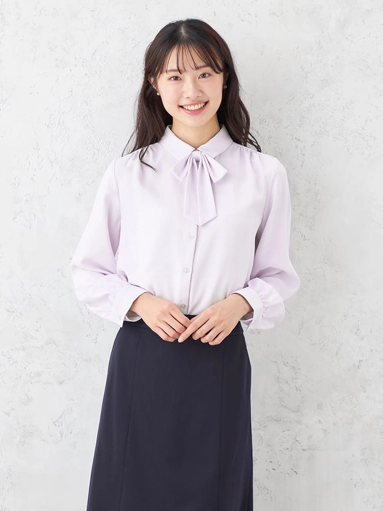取り外し可能なリボン付きで、気分やコーディネイトによって2通りの着こなしが楽しめるレギュラーブラウス。