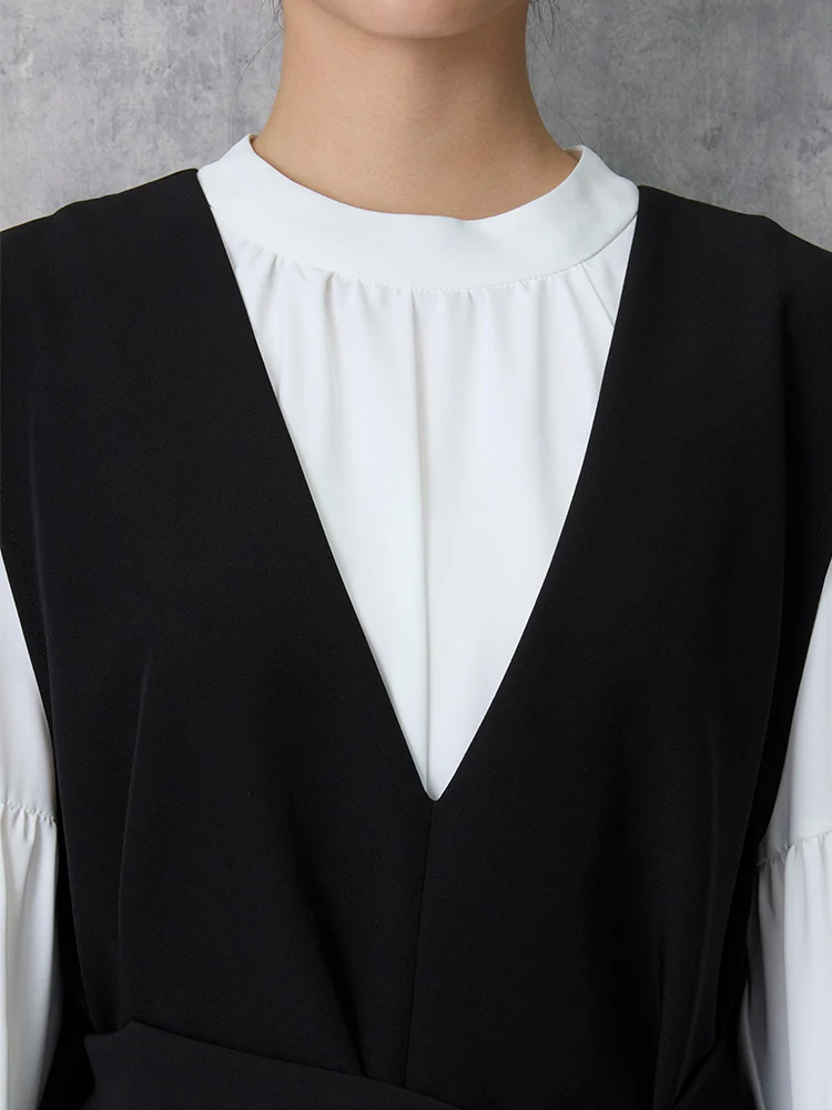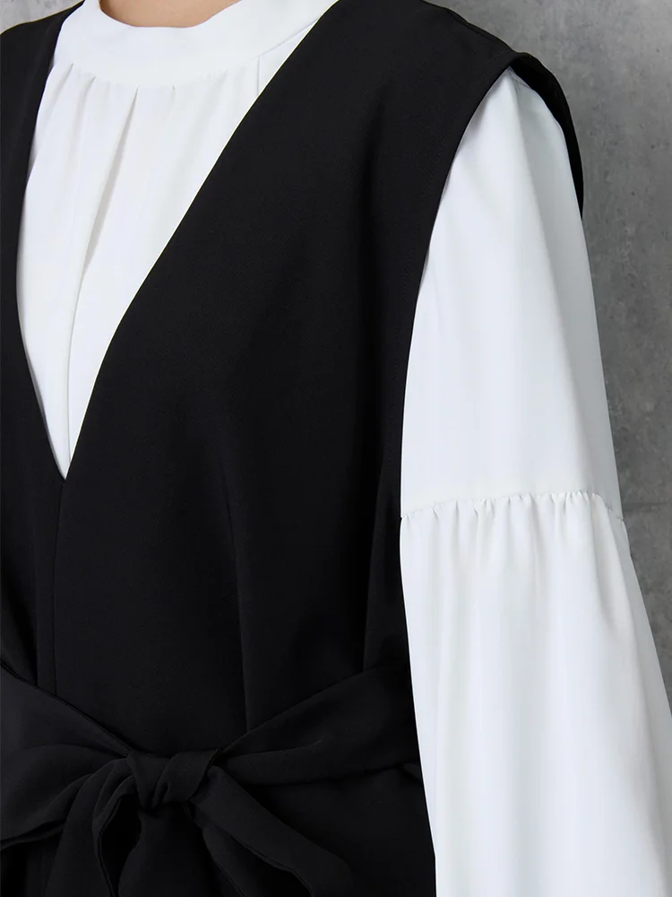 ジレは身体のラインを拾いすぎないスペックで、ウエストリボンデザインで体型カバーにも◎