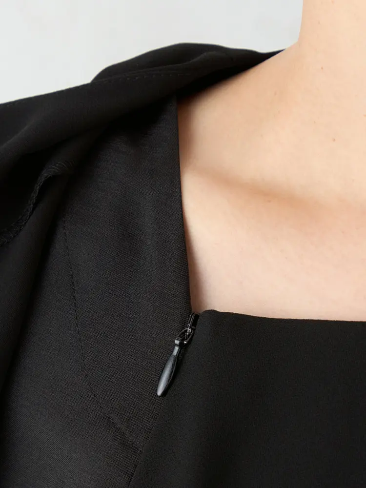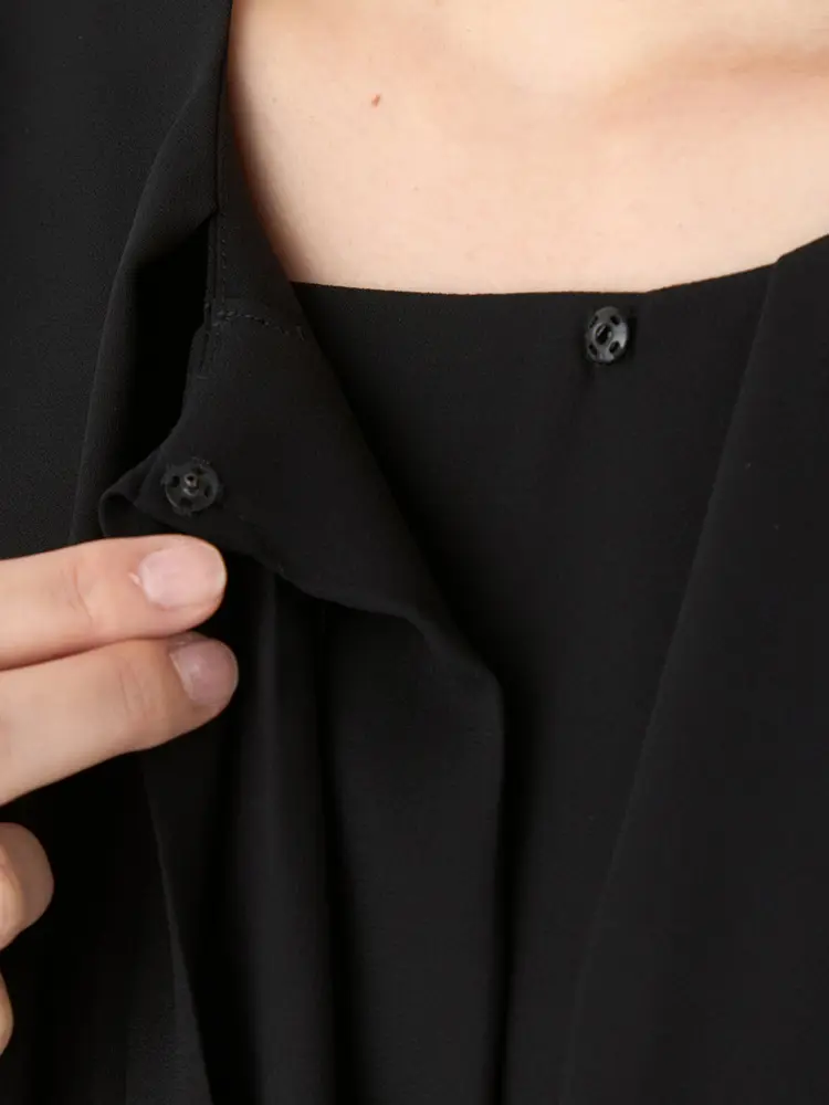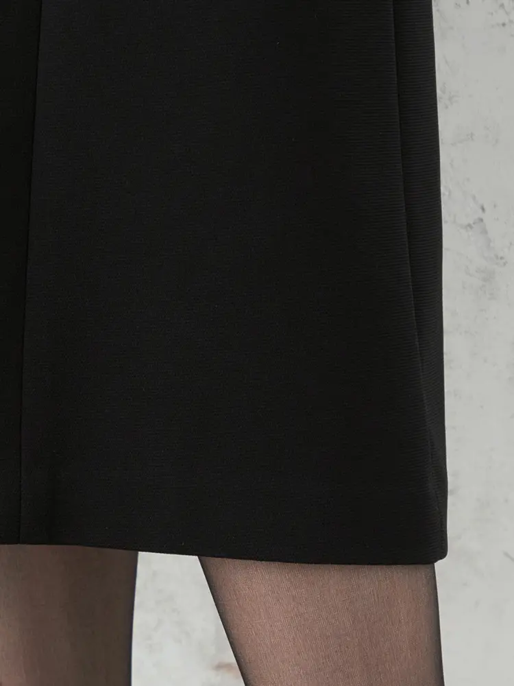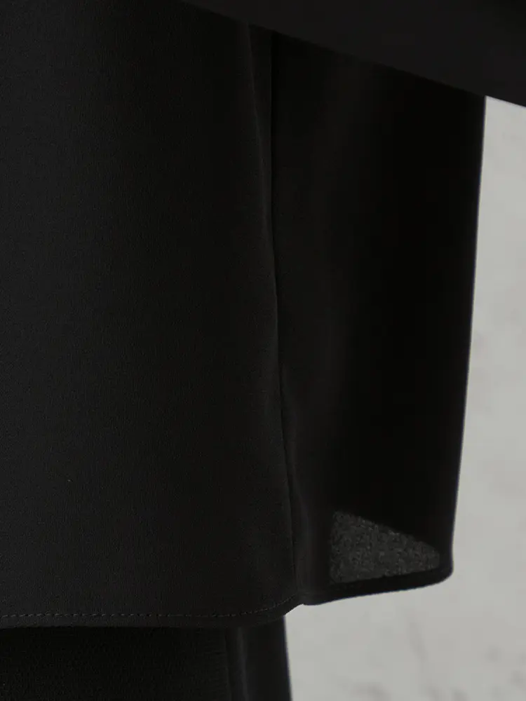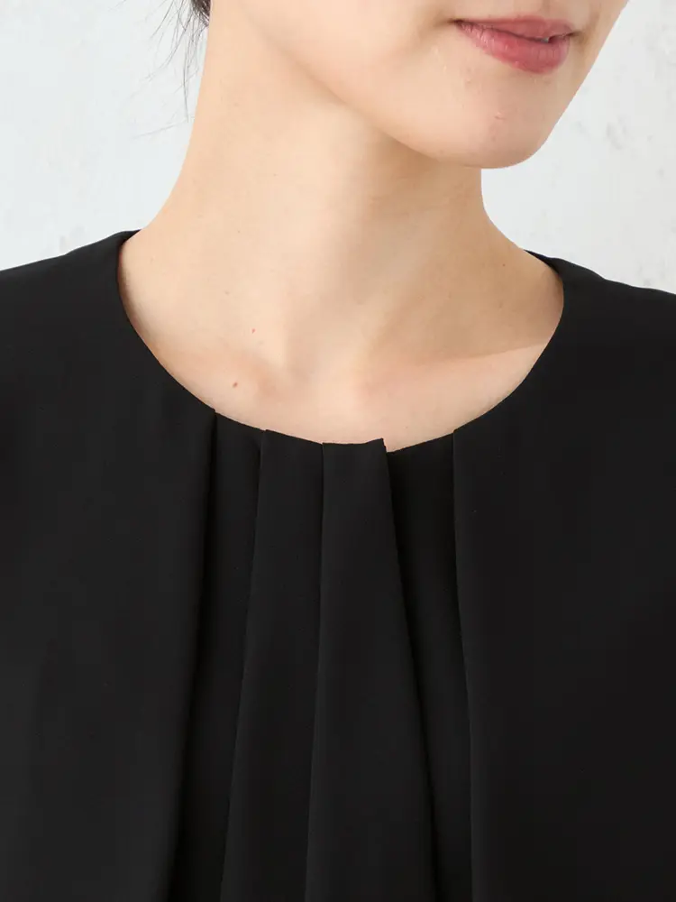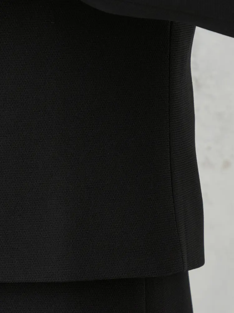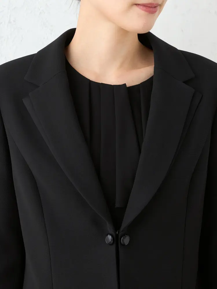 ジャケットを脱いでもブラウスを重ねたような華やかなデザインが魅力です。