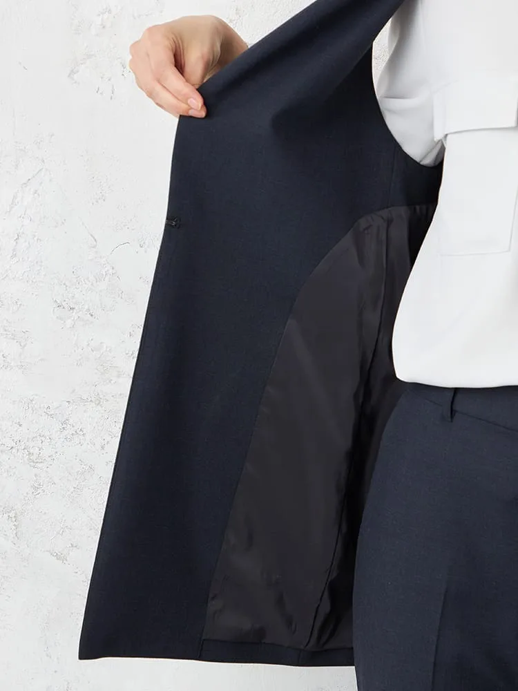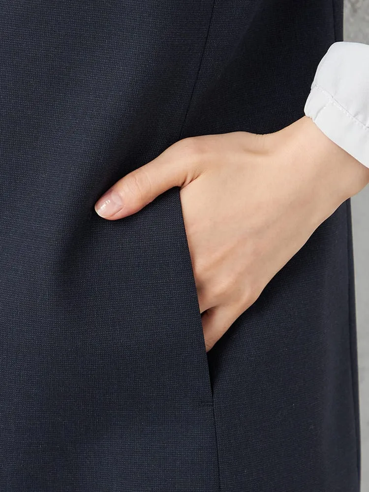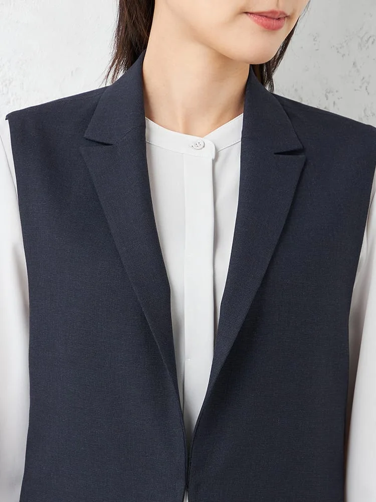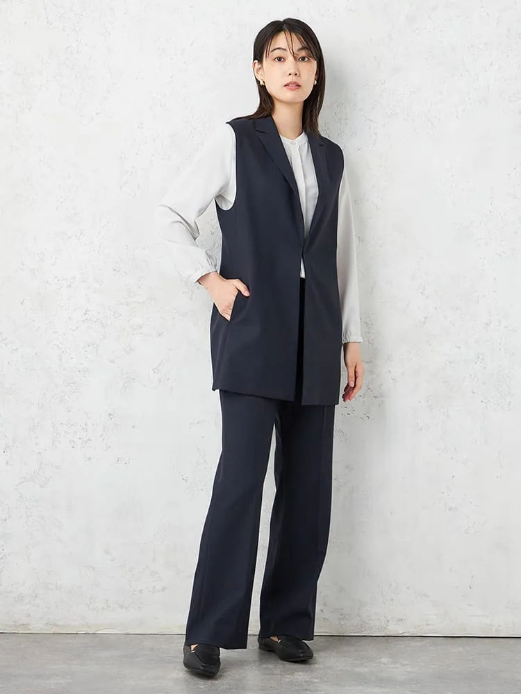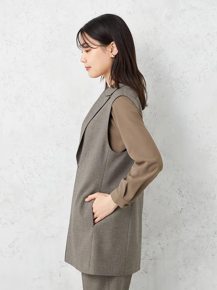 衿付きのテーラードタイプできちんと感をキープしたベスト。釦をつけずシンプルに仕上げました。
