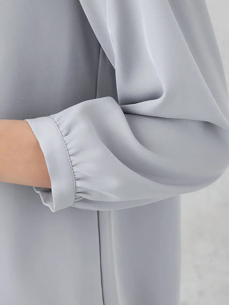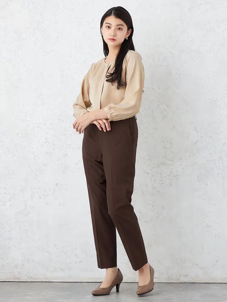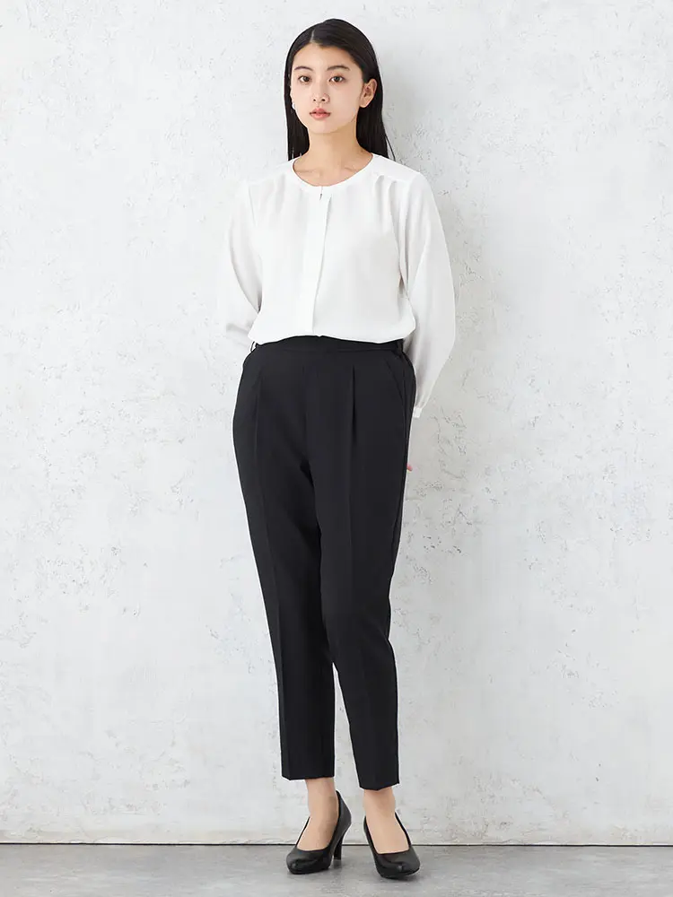 柔らかく高級感のあるツイル素材を使用し、前身頃の縦タックと重ね生地のデザインがスマートなスタイルアップを叶えます。