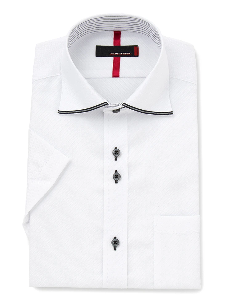 襟元のライン使いが斬新な半袖シャツ。清潔感溢れるホワイトカラーで、ボタンやボタンホールステッチなどにブラックをアクセントで効かせることでメリハリのある表情に仕上げています。綿にポリエステルを混紡した素材はシワになりにくく、形態安定加工によりお手入れがしやすくなっているのがポイント。ストレッチ性にも優れているため、細身のシルエットながら動きやすく快適な着心地です。モダンなセミワイドカラーは、ボタンを開いても獲り立ちが綺麗で、面持ちをスタイリッシュに引き立てます。台襟内側にボーダー柄の生地を重ね、さりげない洒脱さを演出。襟汚れが目立ちにくく、ボタンを開いた時にも安心です。前立てはプラケットフロントを採用しています。