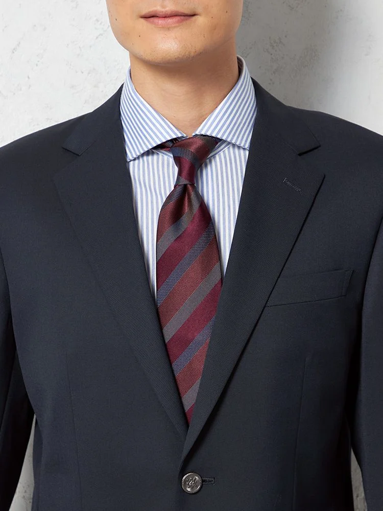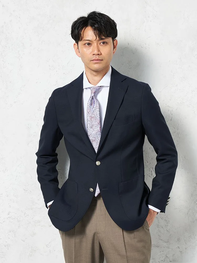 通年で着用できる生地を使用したベーシックなネイビーのジャケット。