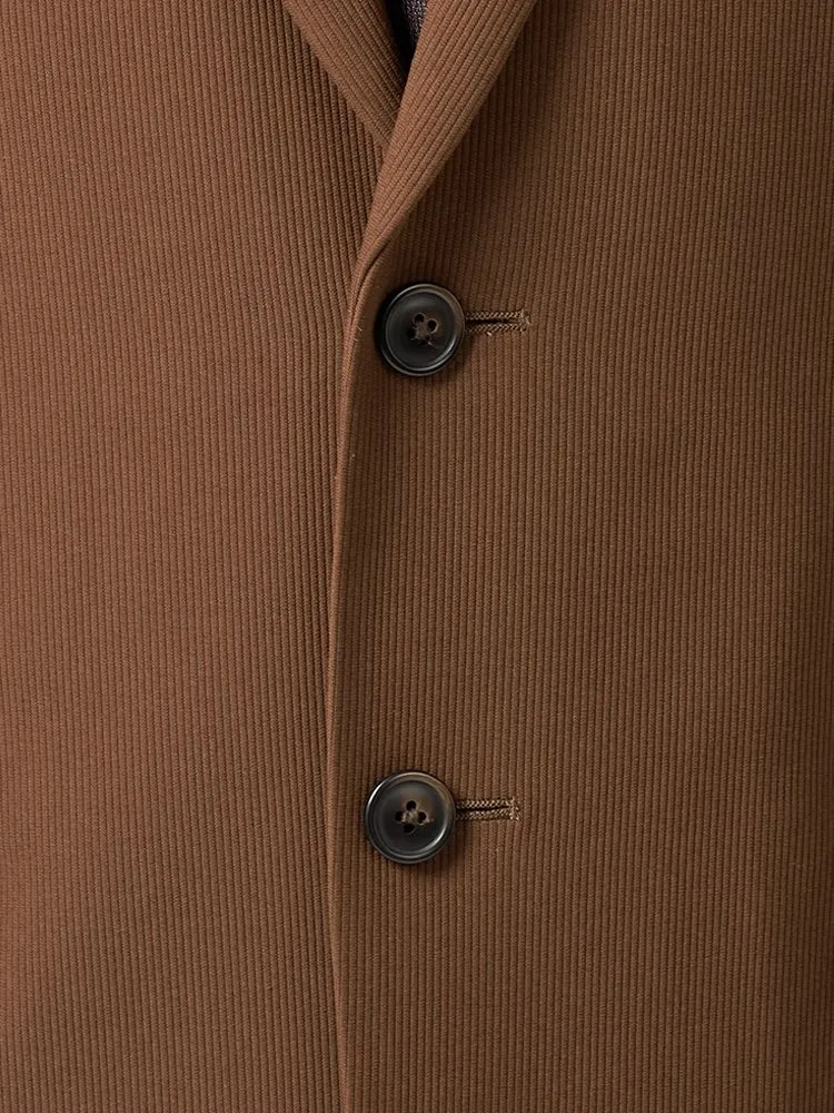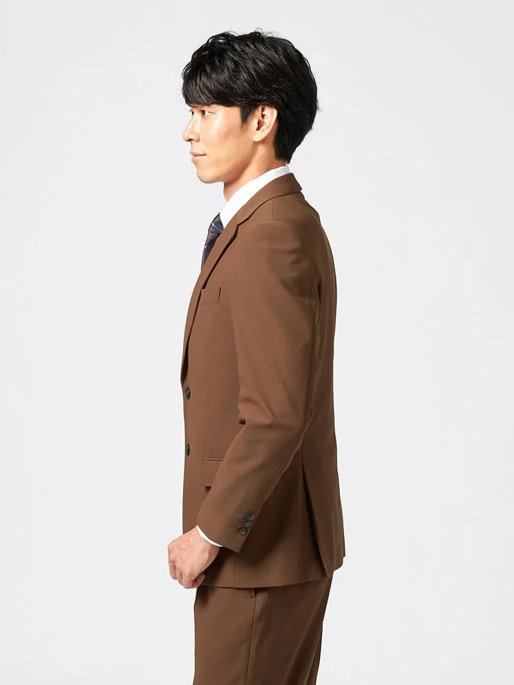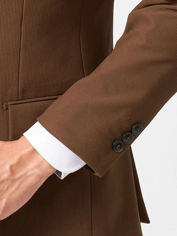 パットなどに軽量な資材を使用し、肩回りをパワーネット仕様にした、軽やかな仕立てのニットコーデュロイスーツ。