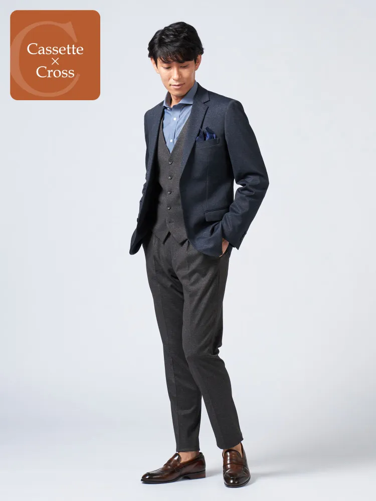 シリーズ内で簡単にコーディネートが楽しめる『Cassette Cross-カセットクロス-』ベスト付きのスリーピーススーツです。