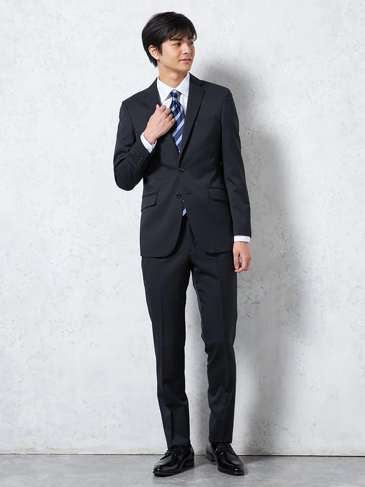 リクルートにぴったりなネイビー無地の上下セットアップスーツです。