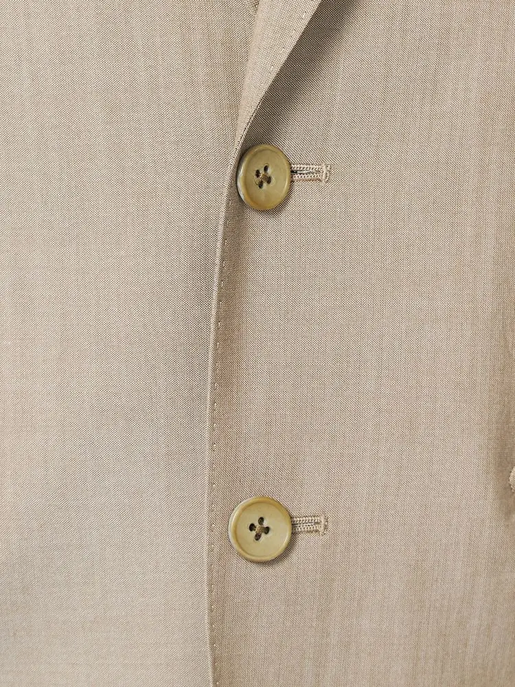 段返りの3つボタンデザインで、シンプルながらも品格を感じさせる仕上がり。きちんと感があり、フォーマルにも最適です。