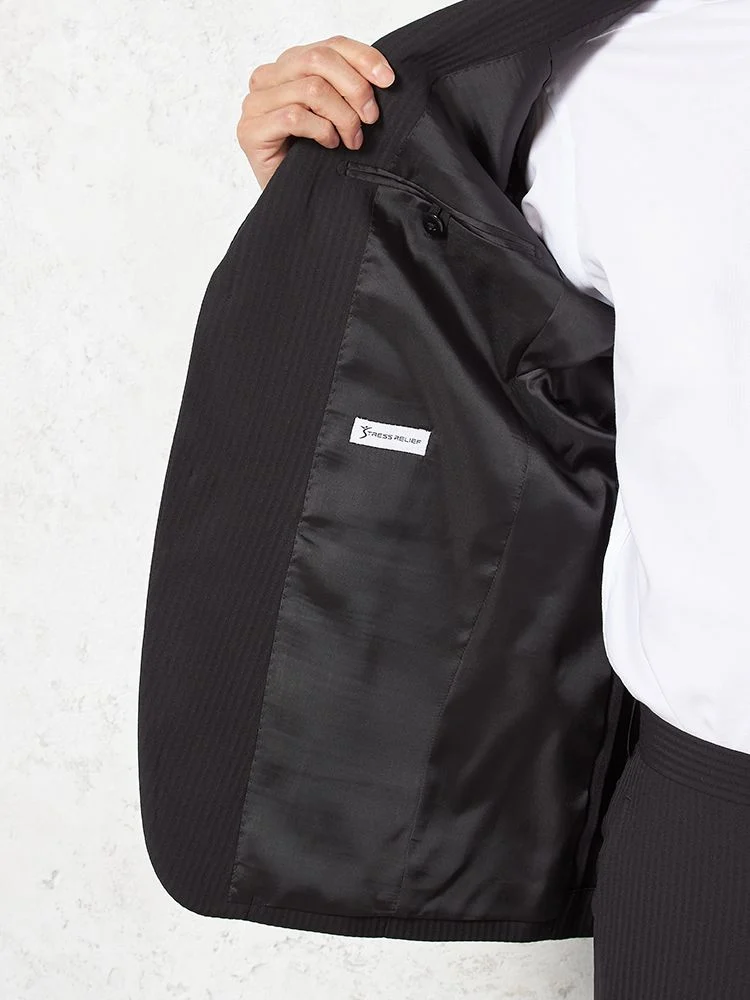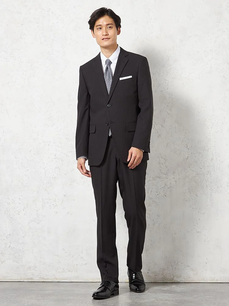 【即納】スーツ 2つボタン【WEB限定】4WAYストレッチ ストライプ ブラック 通年
