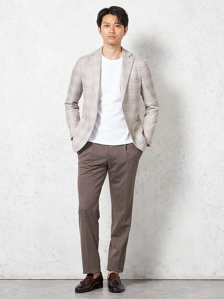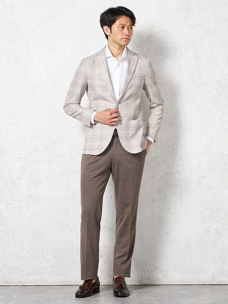 明るめのベージュトーンのチェック柄で無地にはないデザイン性をプラス、オフィスはもちろん休日のカジュアルスタイルにもお使いいただけます。