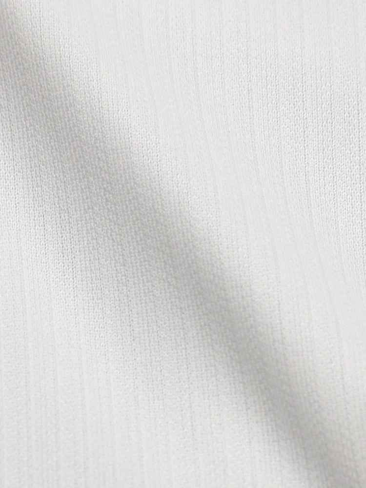 こだわりの日本製生地はソフトなポリエステルニットで、スポーツウェア等にも使われる高機能素材。体の動きに合わせて生地が伸び縮みする高いストレッチ性が特徴で、動作時の負荷が少なく着用ストレスも軽減します。