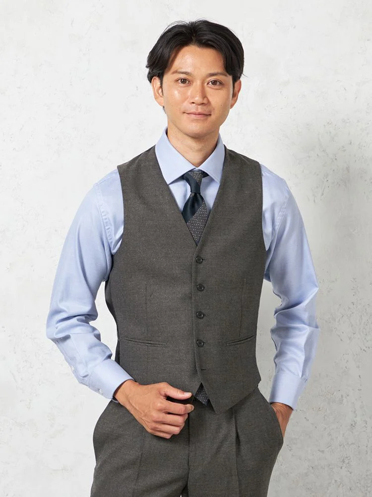 暗すぎず明るすぎない色合いは、主張の強いネクタイとも好相性。