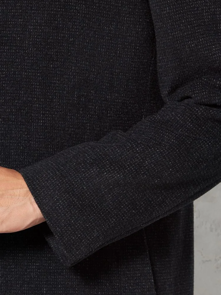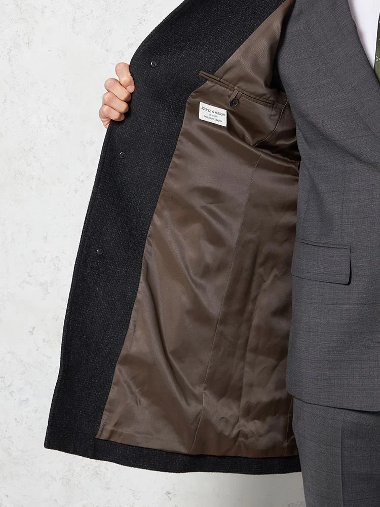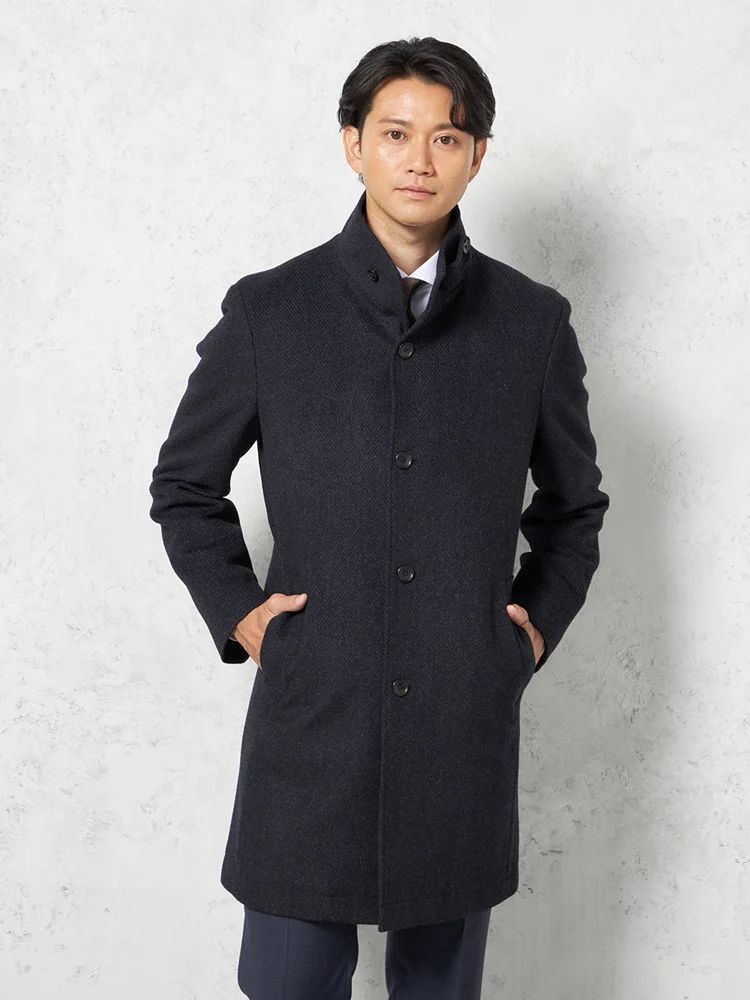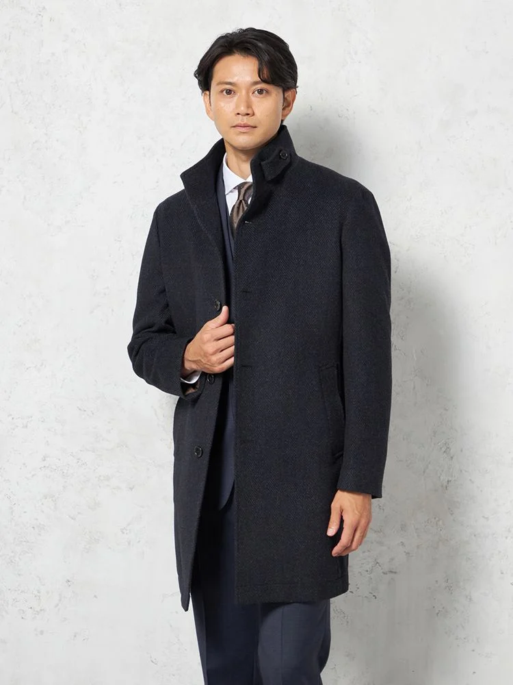 尾州産のアンゴラ混プレミアムウール素材を採用したコートは、上質で柔らかな風合いを楽しめます。