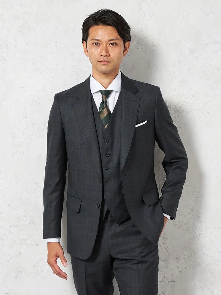 風合いが良いSUPER100'S素材を使用したスリーピーススーツ。