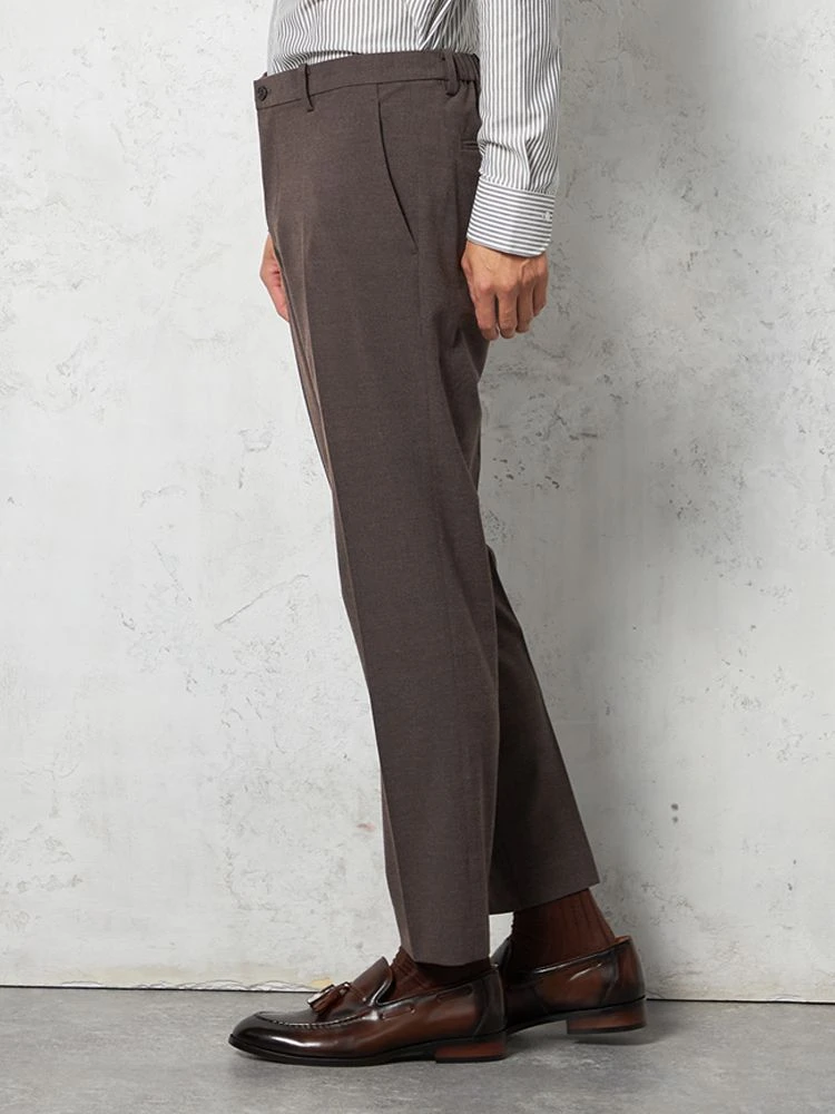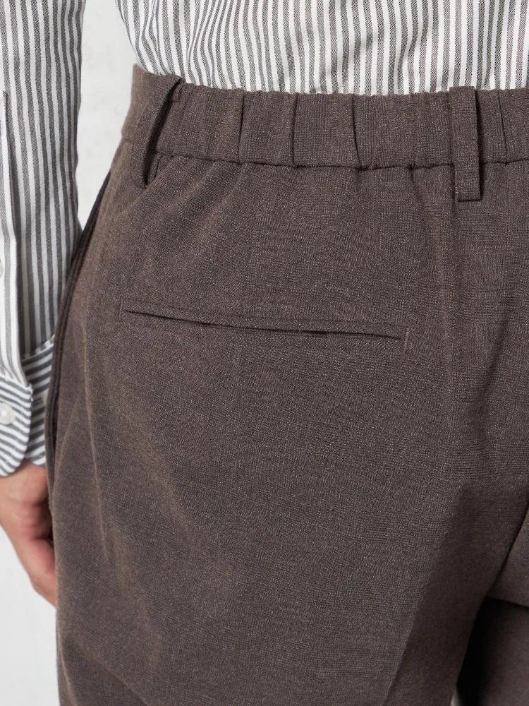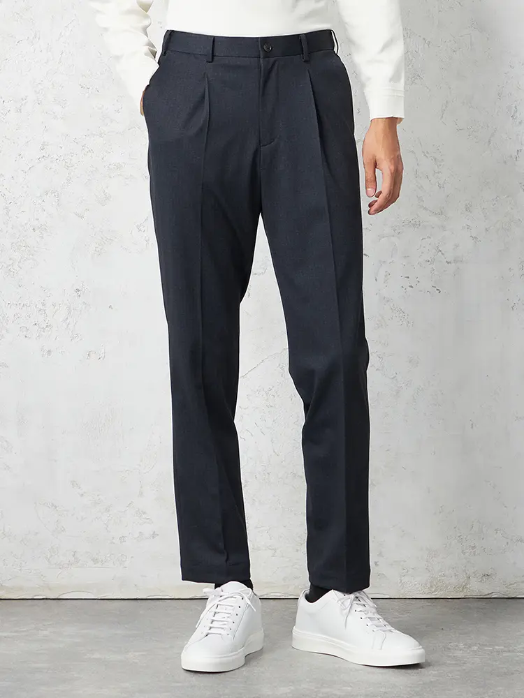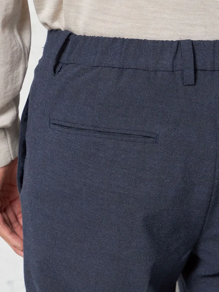 パンツの腰回りに生地の折り込みがなく、スッキリとしたシルエットを実現します。シンプルで洗練された印象を与え、すっきりとした着こなしが可能です。