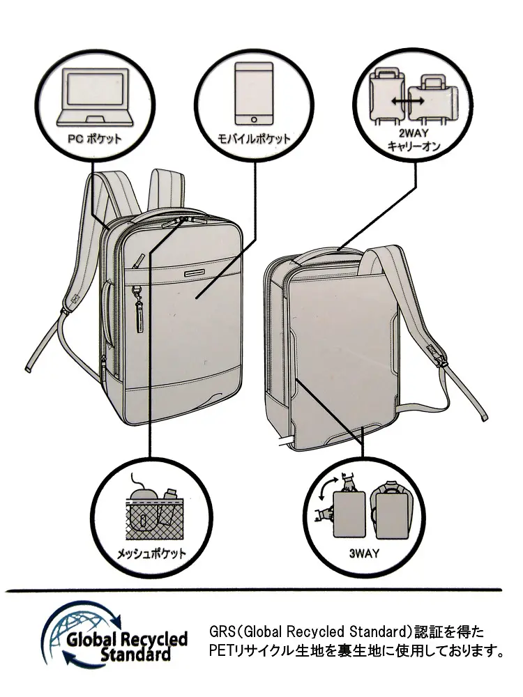 縦・横2方向でキャリーバーに通せるスリットがついて、出張にも最適。