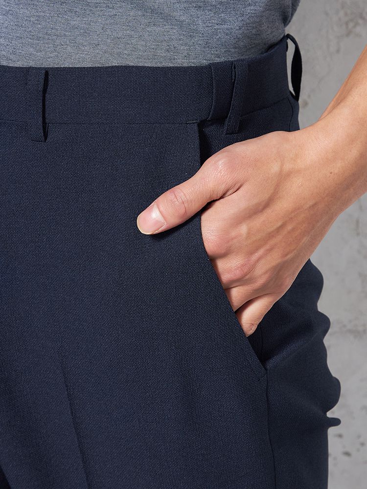 パンツの腰回りに生地の折り込みがなく、スッキリとしたシルエットを実現します。シンプルで洗練された印象を与え、すっきりとした着こなしが可能です。