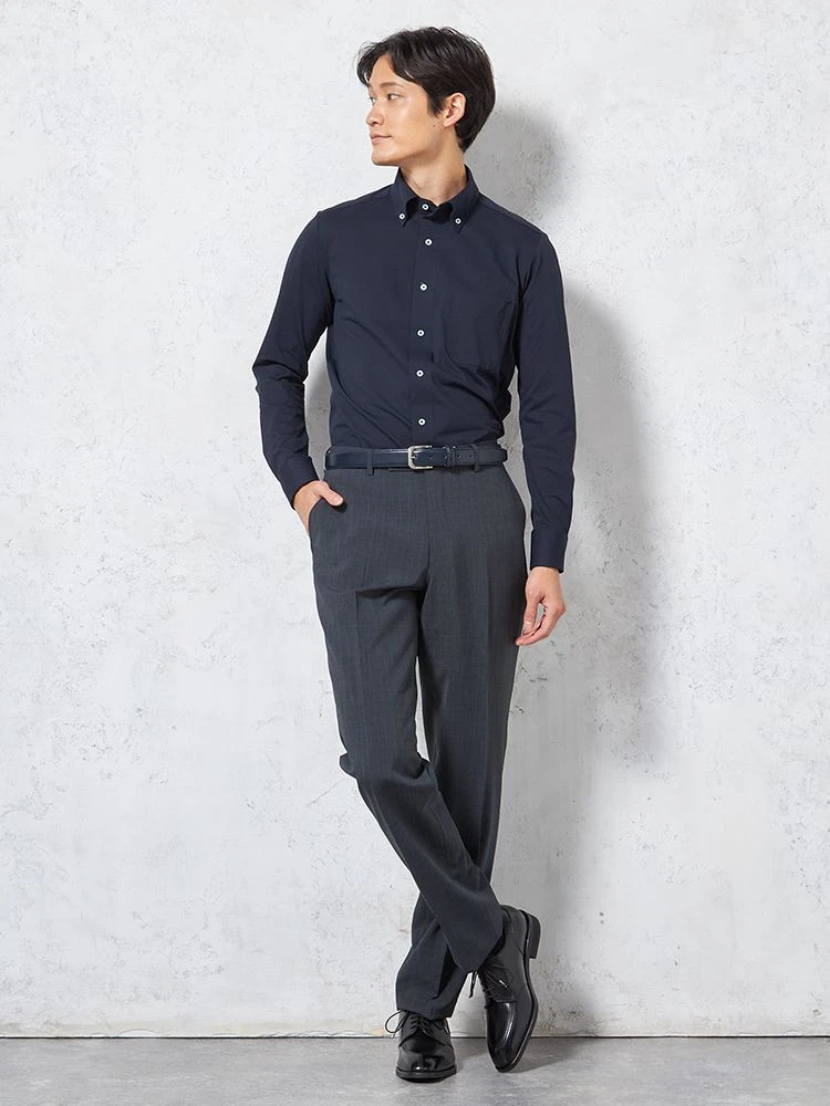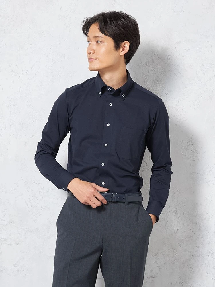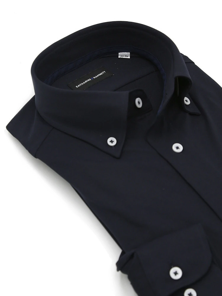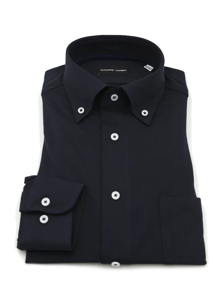 【KATHARINE E HAMNETT-キャサリン・イー・ハムネット-】長袖 ワイシャツ ボタンダウン 360°ストレッチ 吸水速乾 無地 通年(ネイビー)