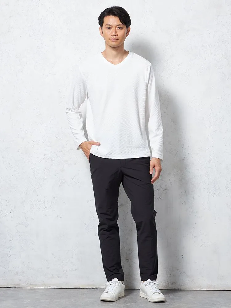 浅めのVネックは顔回りをすっきりと見せつつ上品な印象。
