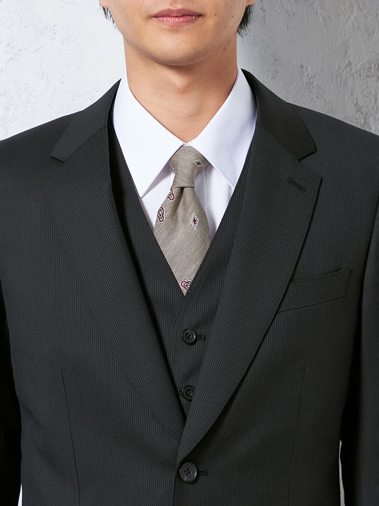 ジャケット、パンツ、ベストの3点セットで、スーツ全体を簡単にコーディネートできます。ビジネスやフォーマルな場面に最適です。