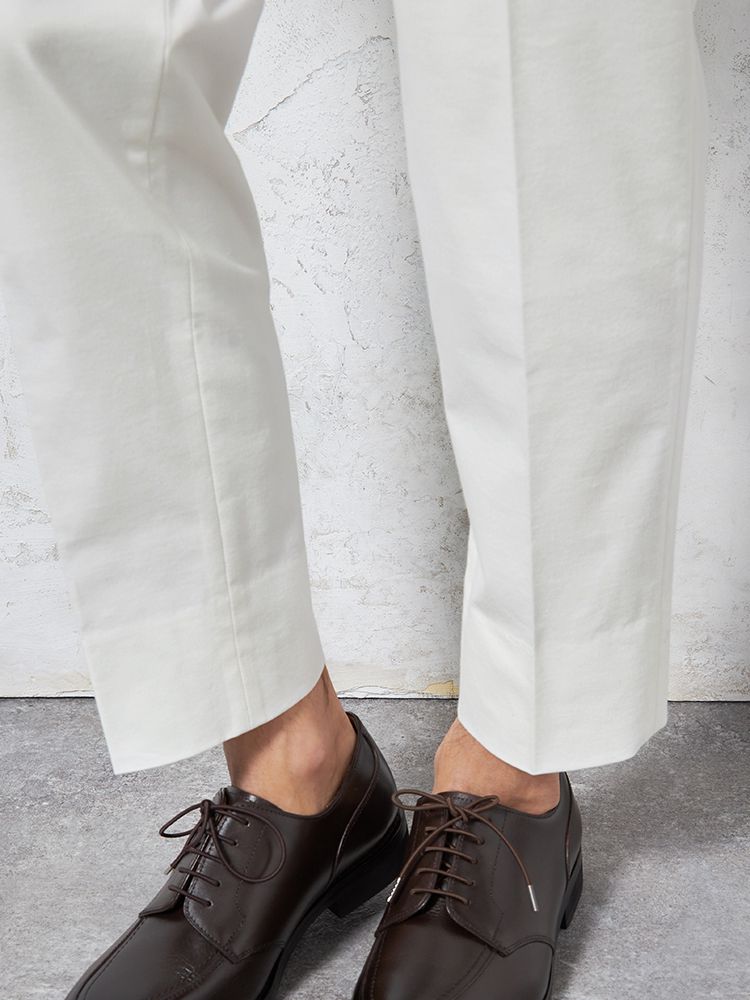 パンツの腰回りに生地の折り込みがなく、スッキリとしたシルエットを実現します。シンプルで洗練された印象を与え、すっきりとした着こなしが可能です。