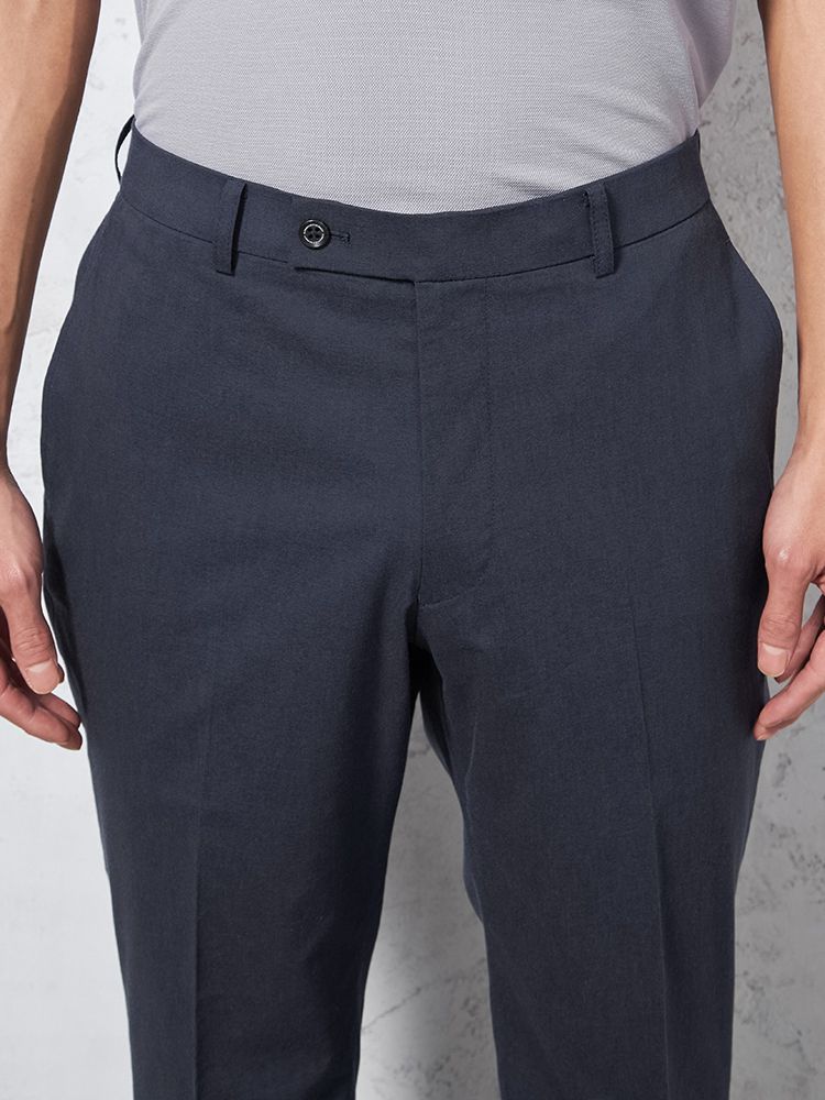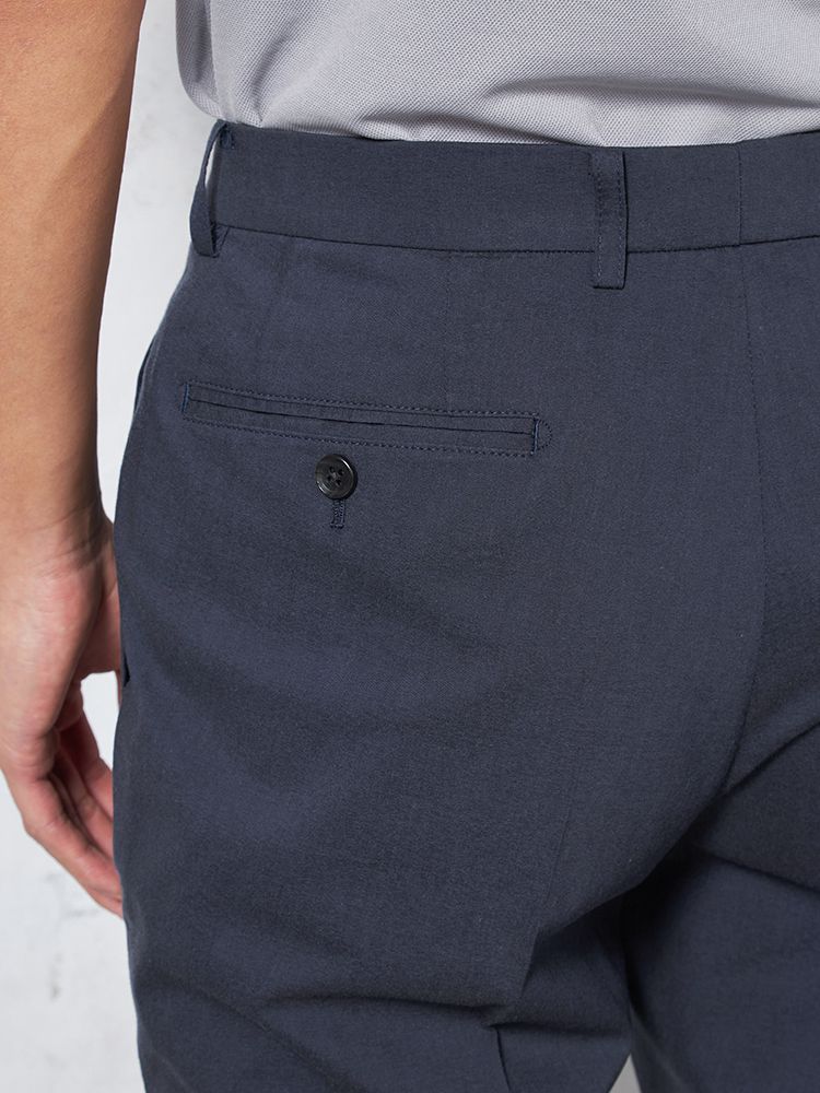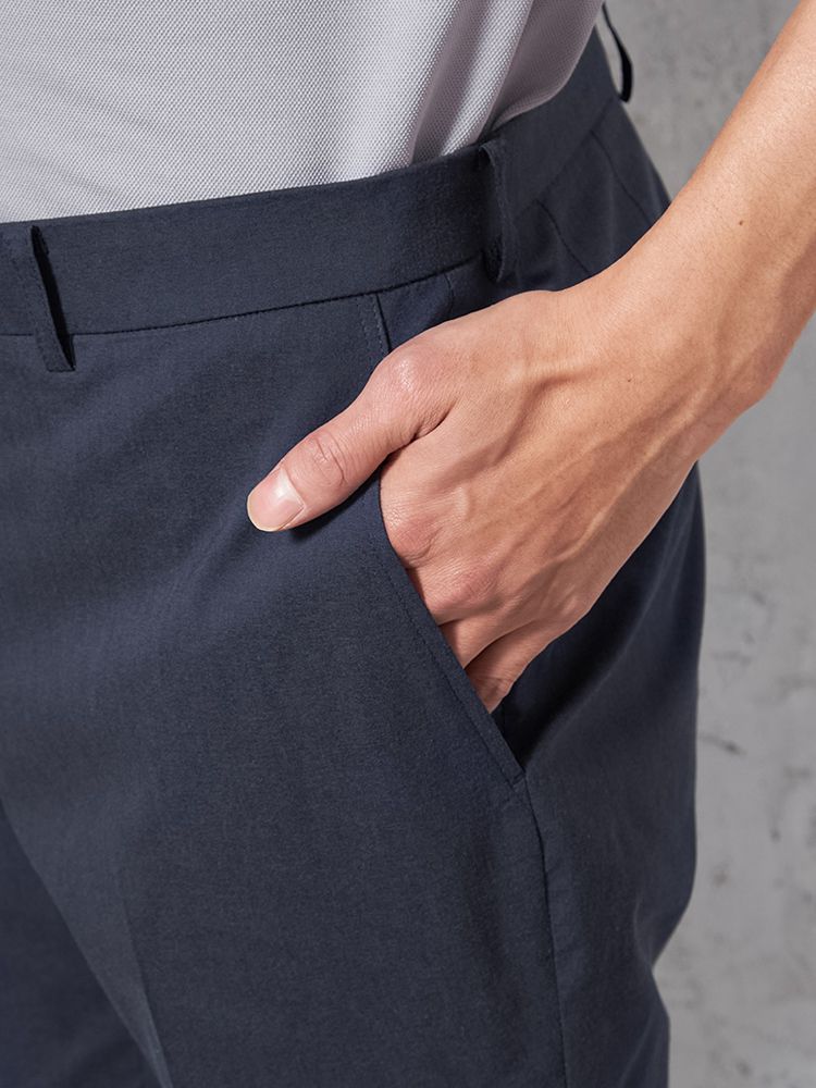 パンツの腰回りに生地の折り込みがなく、スッキリとしたシルエットを実現します。シンプルで洗練された印象を与え、すっきりとした着こなしが可能です。