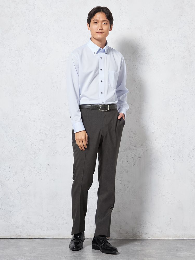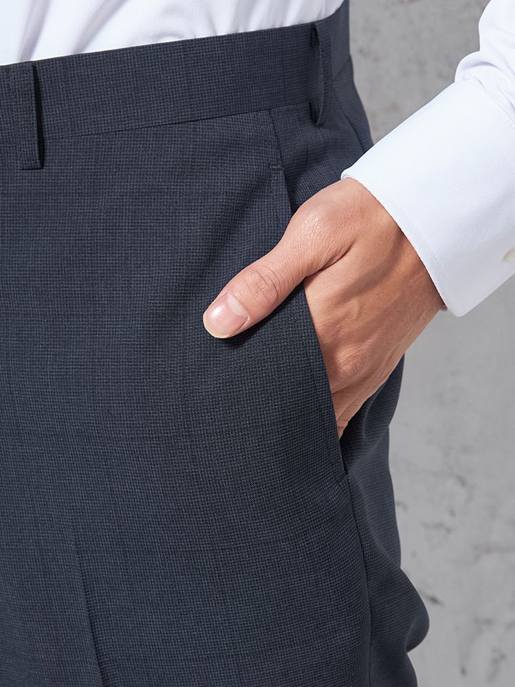 パンツの腰回りに生地の折り込みがなく、スッキリとしたシルエットを実現します。シンプルで洗練された印象を与え、すっきりとした着こなしが可能です。