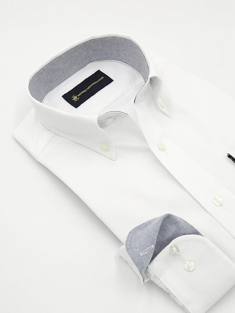 【形態安定】長袖ワイシャツボタンダウン別布ホワイト織柄無地ビバリーヒルズポロクラブ通年
