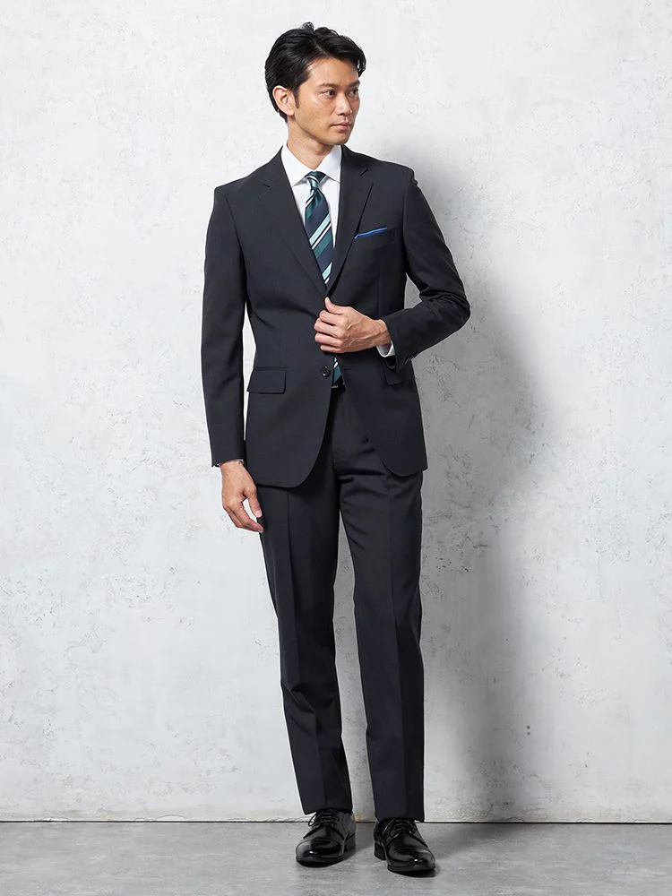 ジャケットはエレガントで動きやすいサイドベンツ仕様、パンツはすっきり見えるノータック仕上げ。