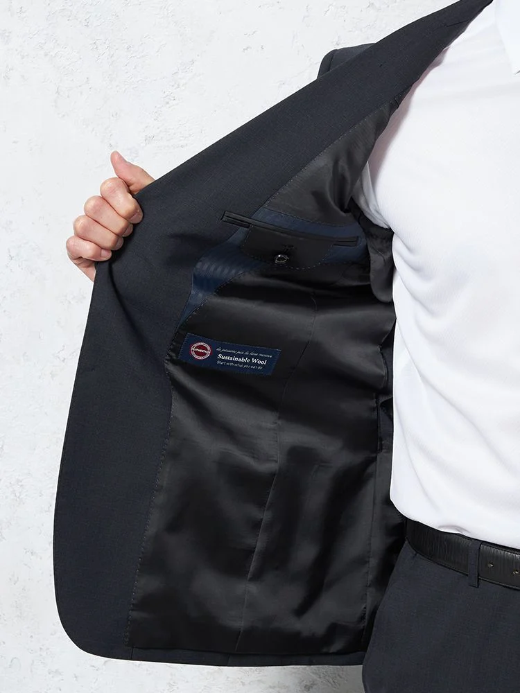 サスティナブルウール素材を使用した【KATHARINE E HAMNETT-キャサリン・イー・ハムネット-】のネイビーツーピーススーツ。