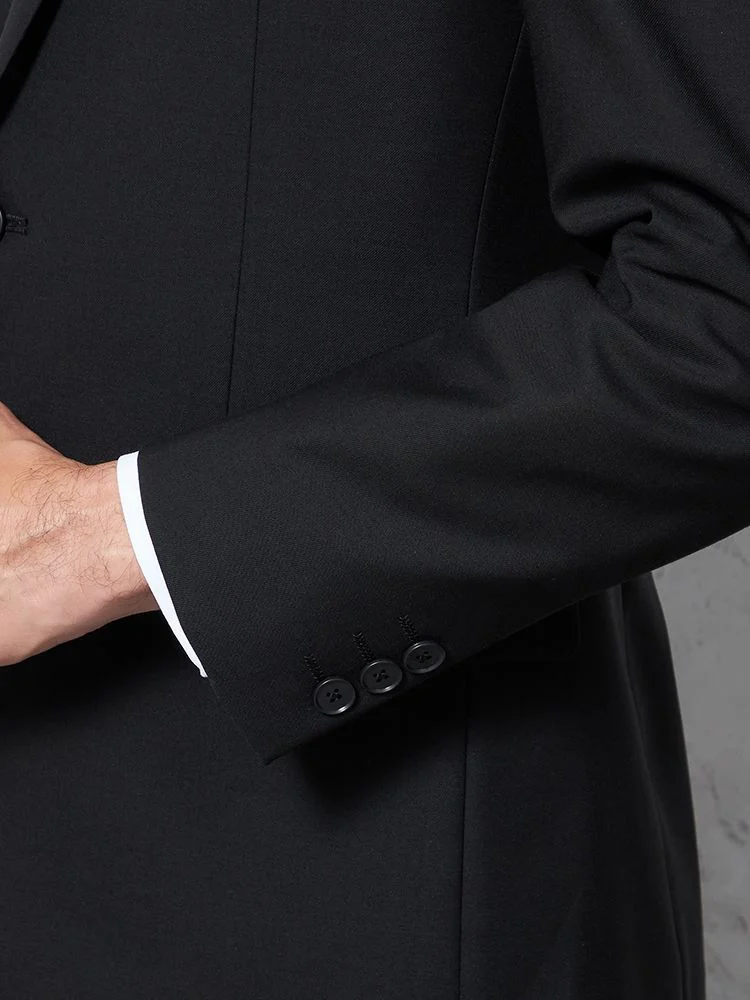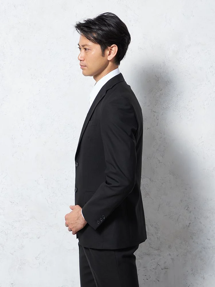 冠婚葬祭で年代問わず使えるベーシックなブラックフォーマルスーツ。