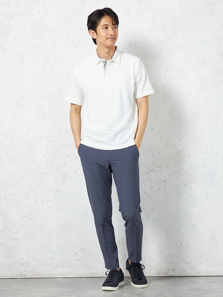 【RUCKEN BACCHAR】半袖 ポロシャツ 衿裏配色 幾何学ジャガード カジュアルインナー 春夏(ホワイト)
