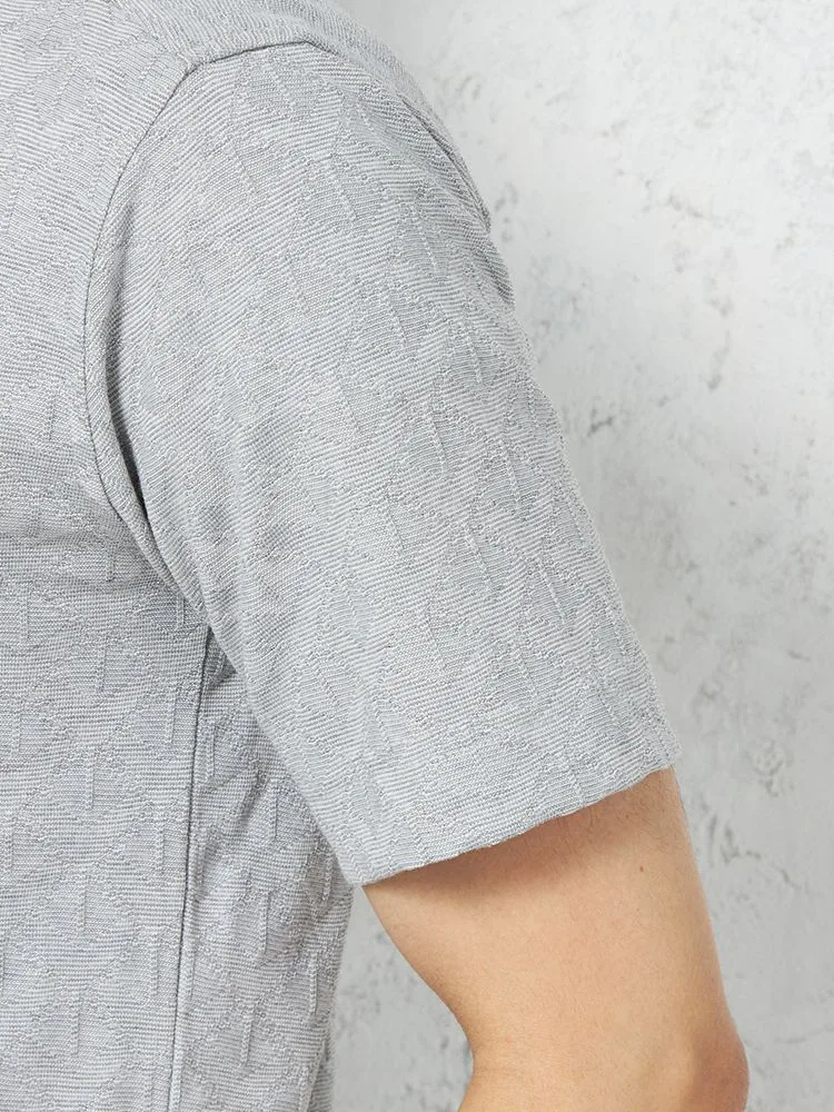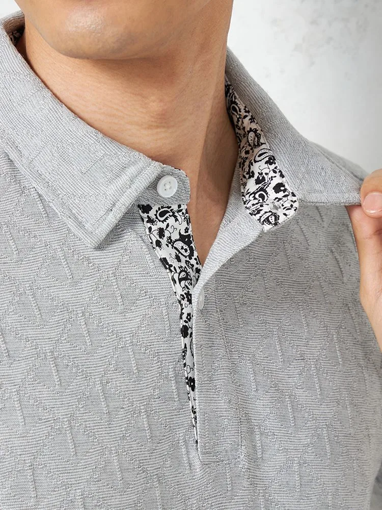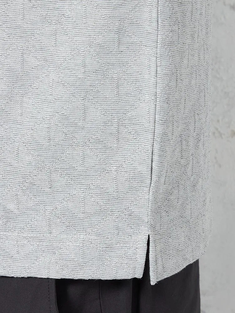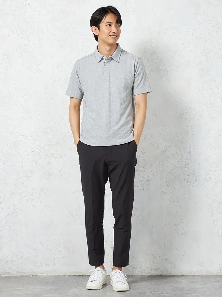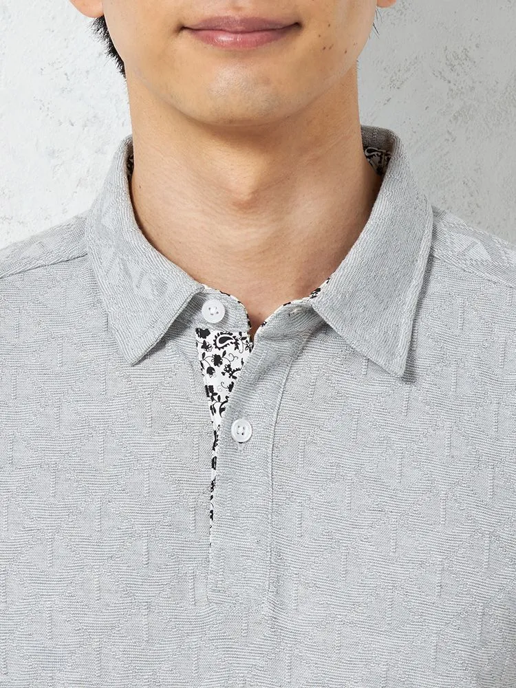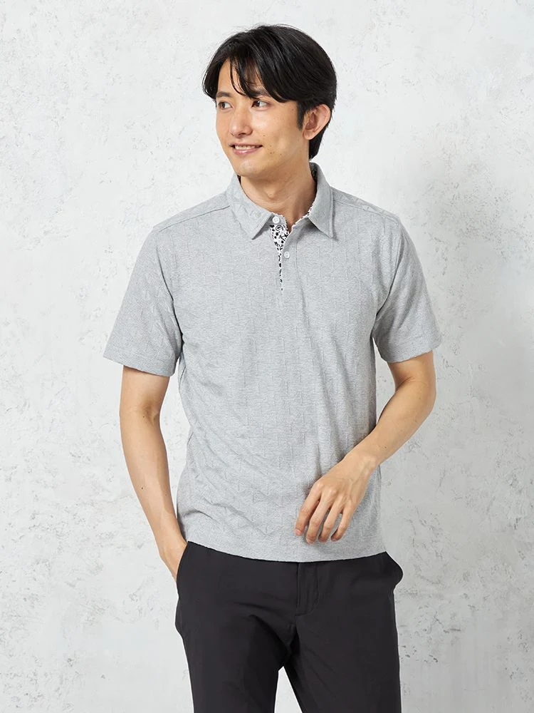 織りで幾何学柄を表現したポリエステル混素材ポロシャツ。