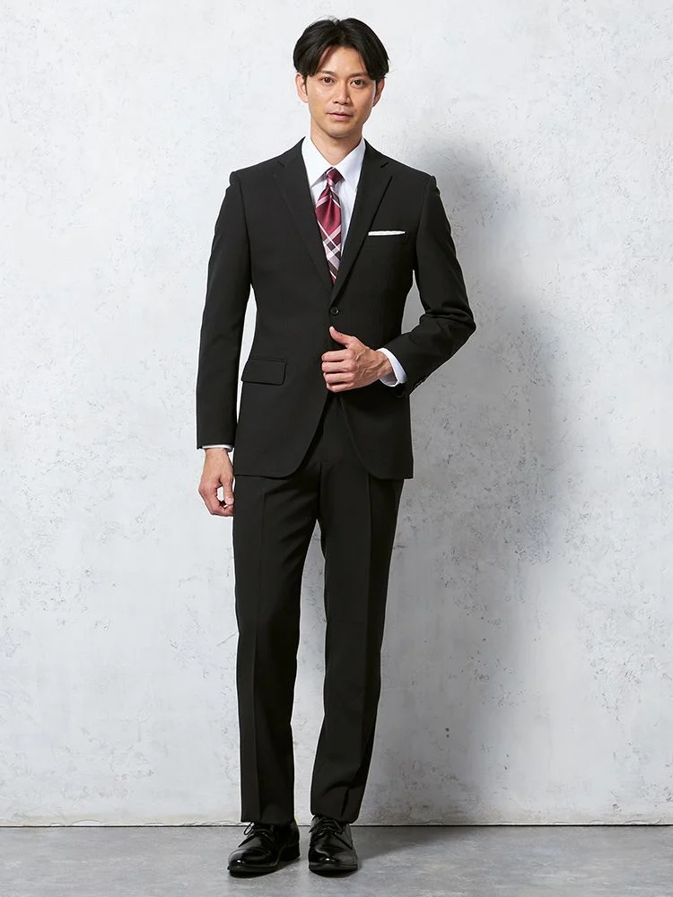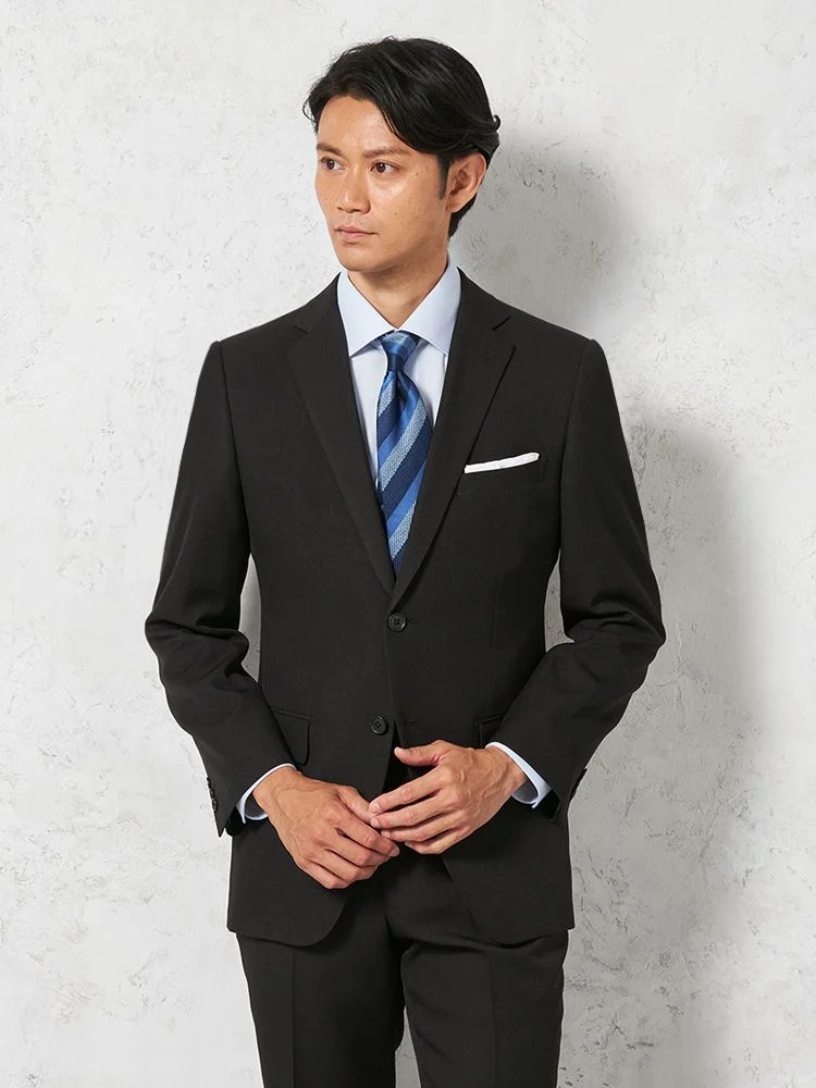 ベーシックなデザインで、シャツやネクタイを選ばず着用できるブラックスーツ。