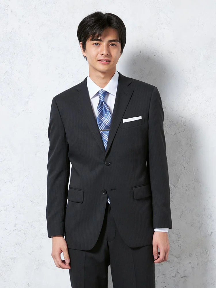 【即納】スーツ 2つボタン【WEB限定】4WAYストレッチ ストライプ ブラック 通年