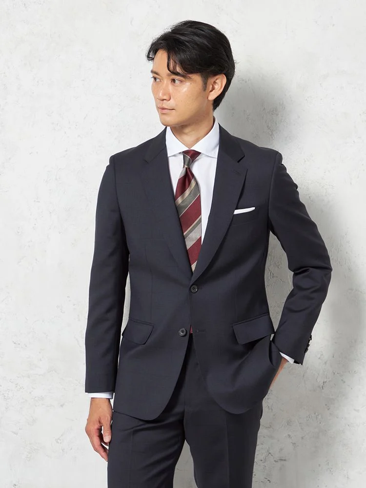 【ウール混】スーツ 2つボタン イタリア製生地 ネイビー チェック リッケンバッカーホワイト