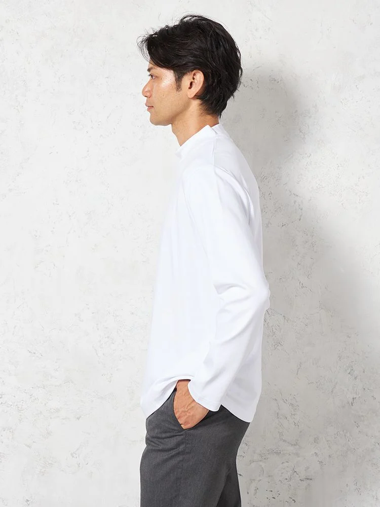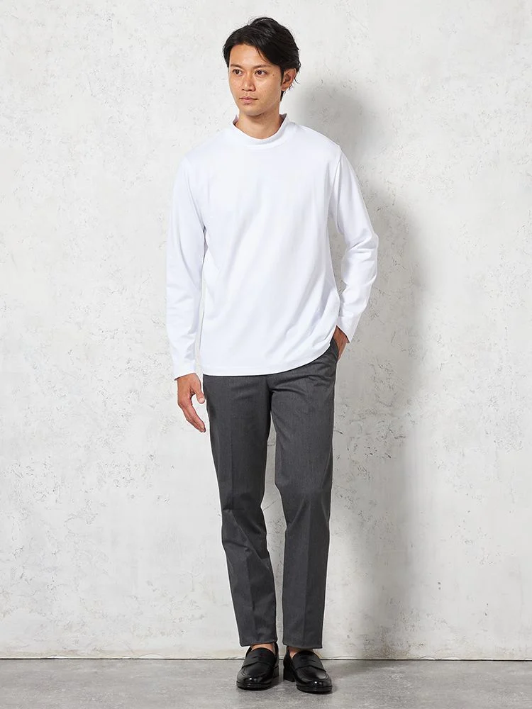綿100パーセントのスムース生地できれい感があり、後ろ襟に高さを出したモックネックで、ジャケットコーデにも映える1枚に仕上げました。