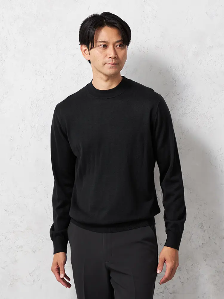 【ウォッシャブル】長袖ニット ファイブミックス モックネック カジュアルインナー 無地 リッケンバッカーブラック 秋冬