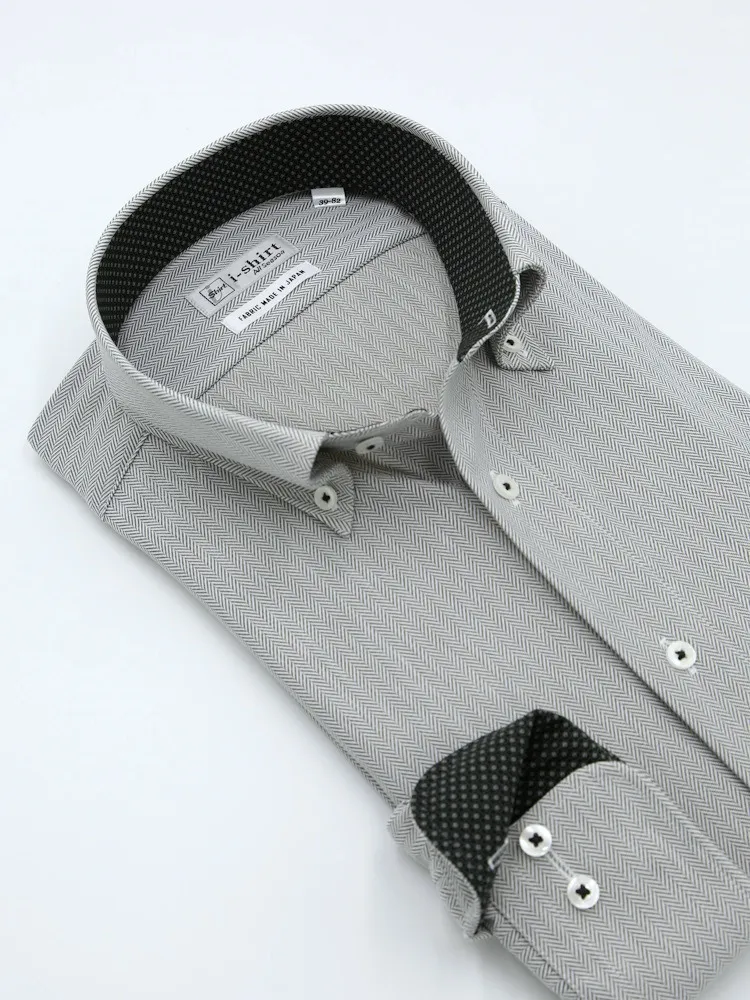 【完全ノーアイロン】長袖 アイシャツ ボタンダウン【トップヘザーシリーズ】ヘリンボン調 ワイシャツ i-shirt 通年(L.グレー)