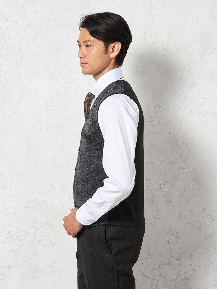 汎用性の高いカラーをベースに、前後の身頃でスタイルの異なるおしゃれな配色デザインに仕上げました。