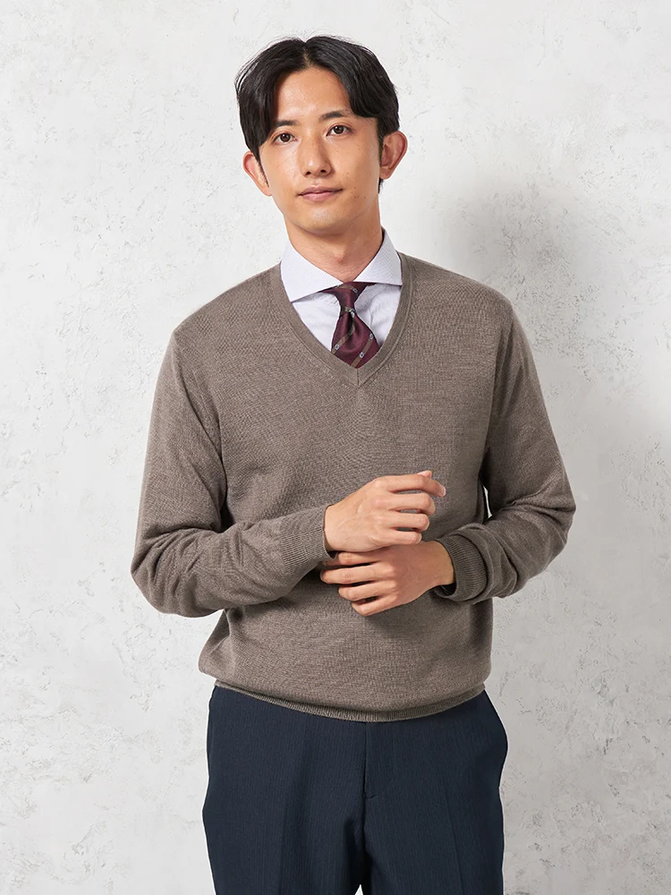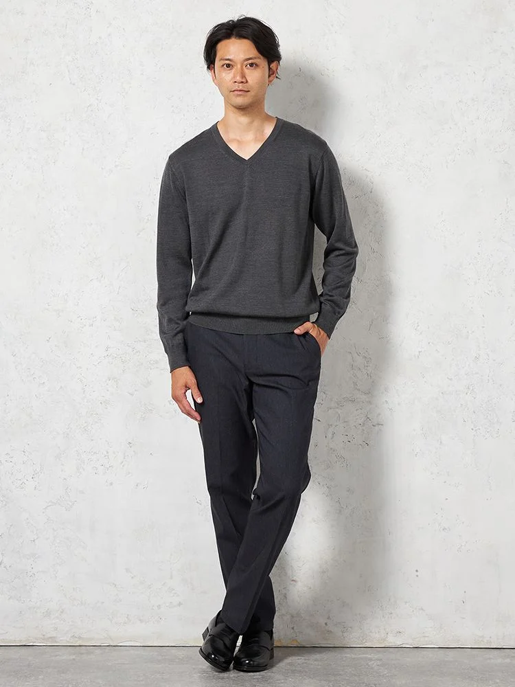 首元は顔まわりをすっきりと見せてくれるVネックを採用し、スタイリッシュな1枚に仕上げました。