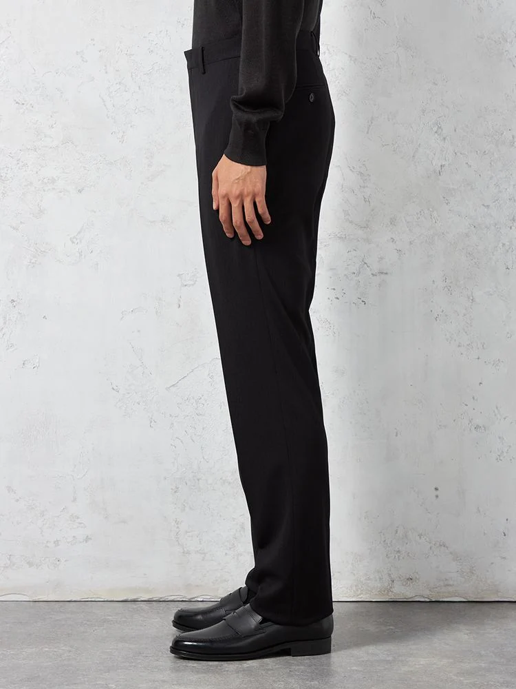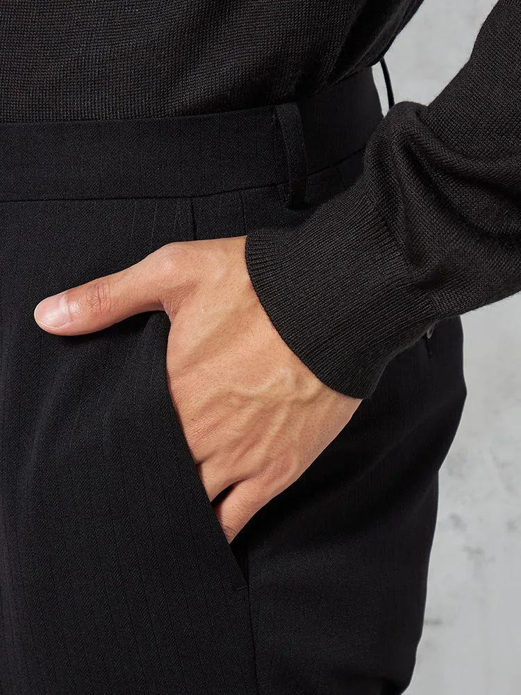 ピンストライプ柄が映えるスタイリッシュなブラックカラーで、コーディネート全体を洗練された印象に見せてくれる細身のストレートラインです。