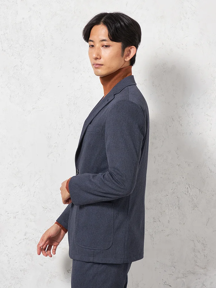 ストレッチ性のあるニットデニム素材にプリントを施しグレンチェック柄を表現したテーラードジャケット。