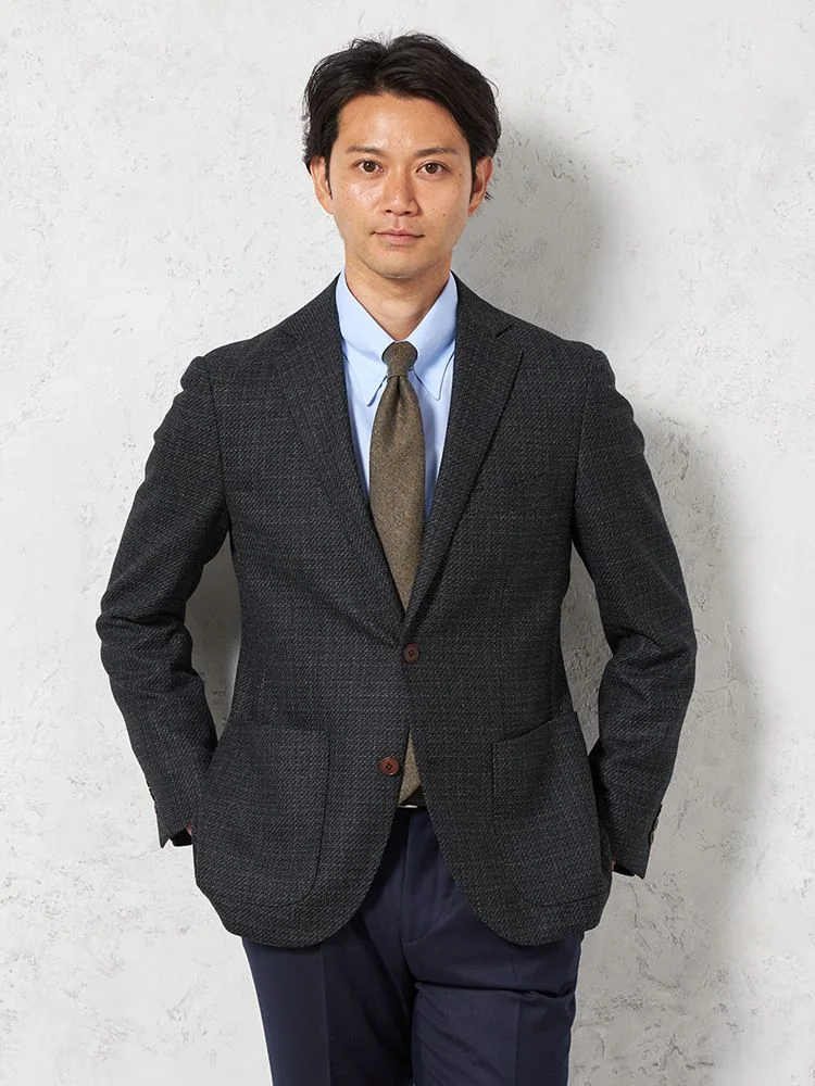 2つボタンのデザインで、クラシックなスタイルを演出。落ち着きと品のあるアイテムです。
